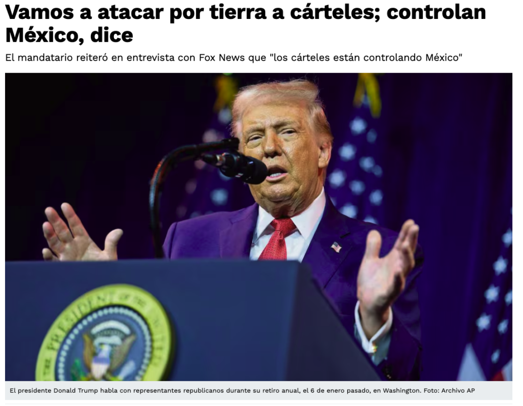 “Vamos a empezar ahora a atacar por tierra a los cárteles. Los cárteles están controlando México”, dijo en una entrevista emitida el jueves por la noche en Fox News.