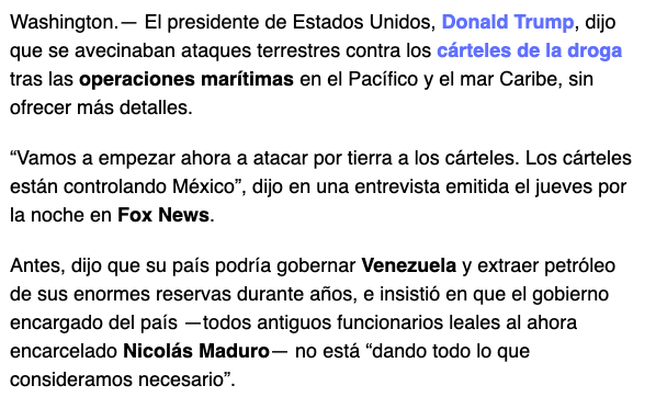 - https://www.eluniversal.com.mx/mundo/trump-prepara-nueva-fase-contra-el-narco-plantea-ataques-por-tierra-contra-carteles-de-la-droga/