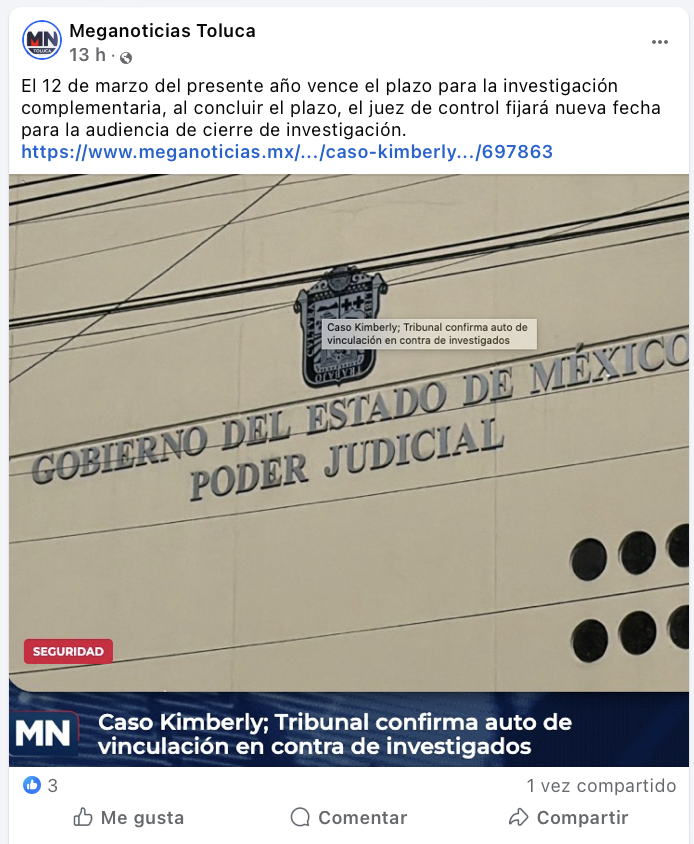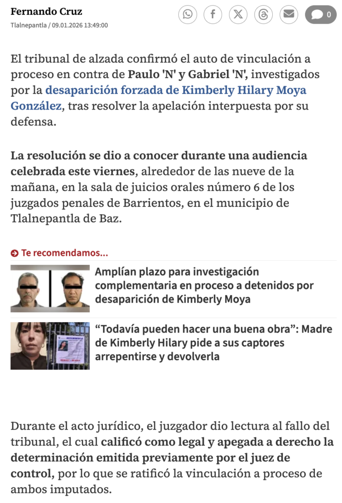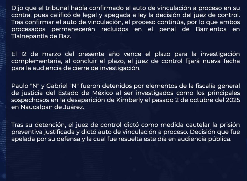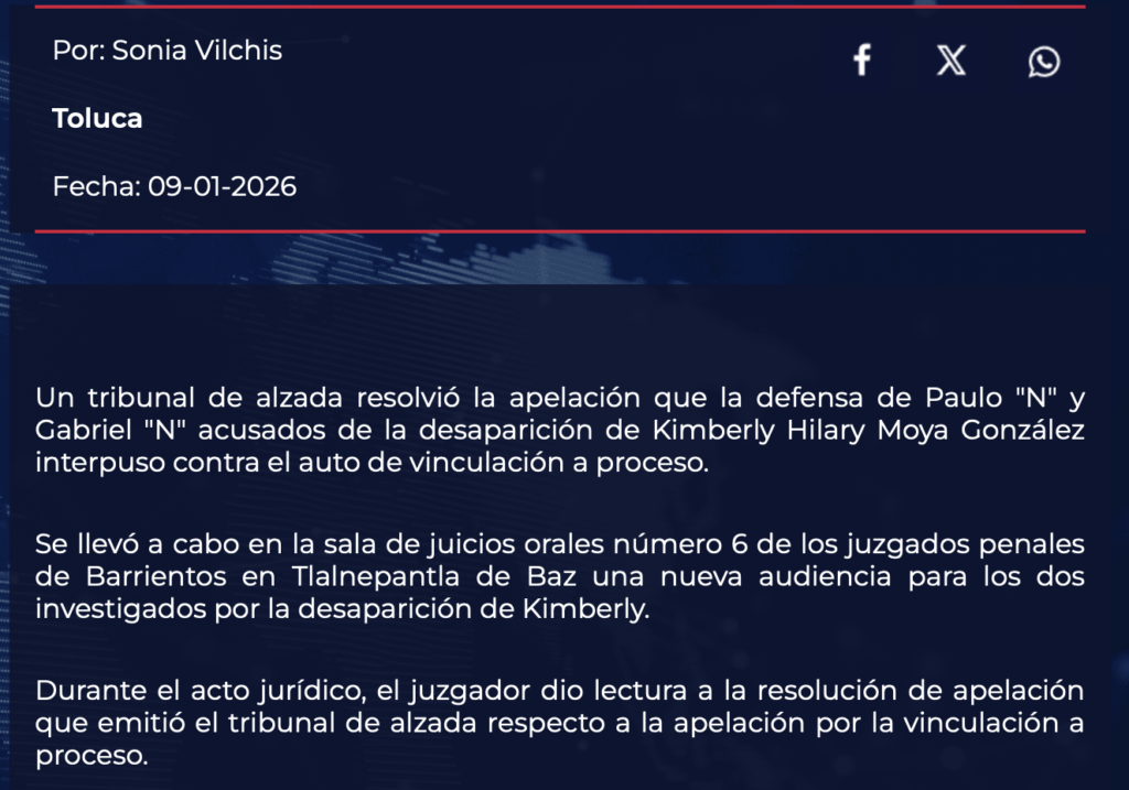 • https://www.meganoticias.mx/toluca/noticia/caso-kimberly-tribunal-confirma-auto-de-vinculacion-en-contra-de-investigados/697863?fbclid=IwY2xjawPPNrhleHRuA2FlbQIxMABicmlkETFmVGY0QjZBOHcydkxWTUQ1c3J0YwZhcHBfaWQQMjIyMDM5MTc4ODIwMDg5MgABHhHcvq8epT8WoVFVnVleRDlGFjLAoPqOgXj1OZoM1SismK2NMrktXtJ-jNbF_aem_qWjrKpW9brk7mFtqV9HvNQ