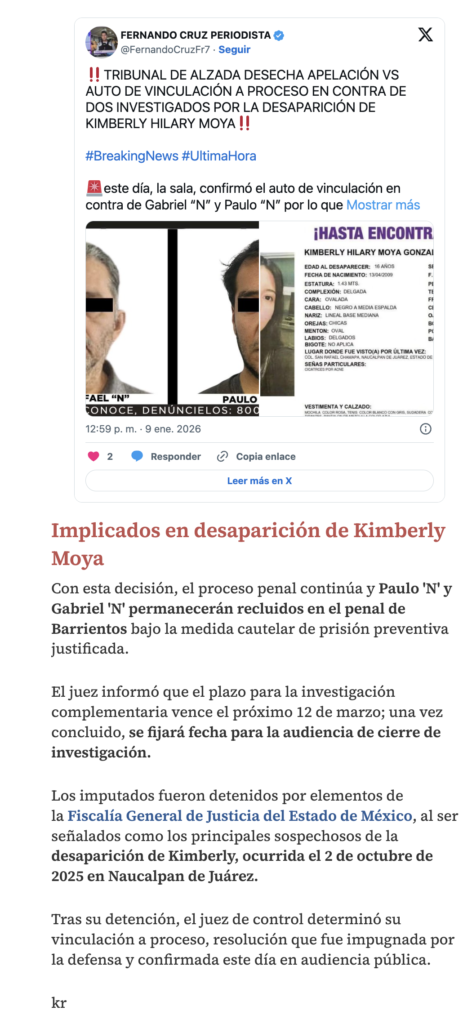 El tribunal de alzada confirmó el auto de vinculación a proceso en contra de Paulo ‘N’ y Gabriel ‘N’, investigados por la desaparición forzada de Kimberly Hilary Moya González, tras resolver la apelación interpuesta por su defensa.