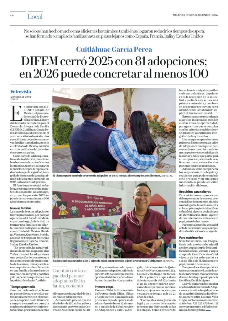 En entrevista con MILENIO Estado de México, el procurador estatal de Protección de Niñas, Niños y Adolescentes del Sistema para el Desarrollo Integral de la Familia (DIFEM), Cuitláhuac García Perea, informó que durante 2025 el amor venció todos los obstáculos y creció hasta poder formar nuevas familias o ampliarlas, no solo en el Estado de México, también en otras entidades del país e incluso en otros países.