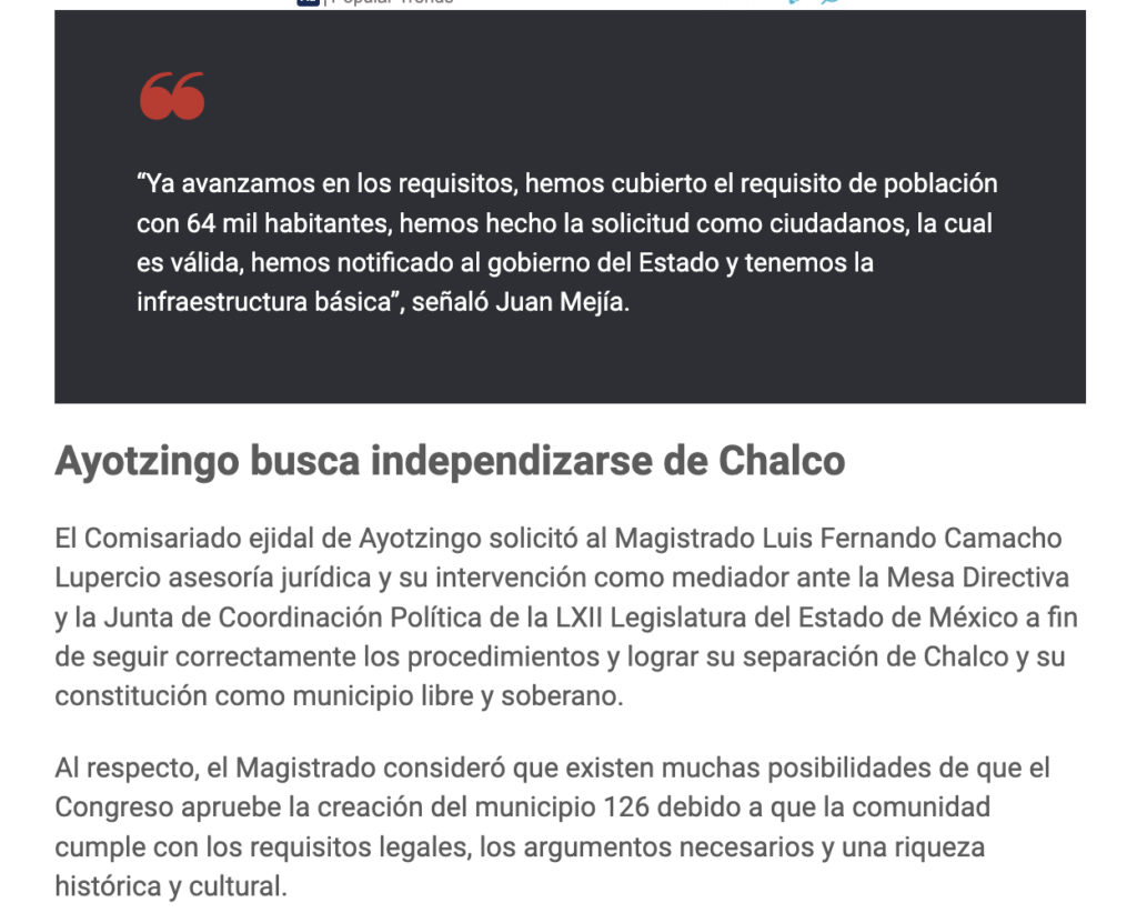El Comisariado ejidal de Ayotzingo solicitó al Magistrado Luis Fernando Camacho Lupercio asesoría jurídica y su intervención como mediador ante la Mesa Directiva y la Junta de Coordinación Política de la LXII Legislatura del Estado de México a fin de seguir correctamente los procedimientos y lograr su separación de Chalco y su constitución como municipio libre y soberano.