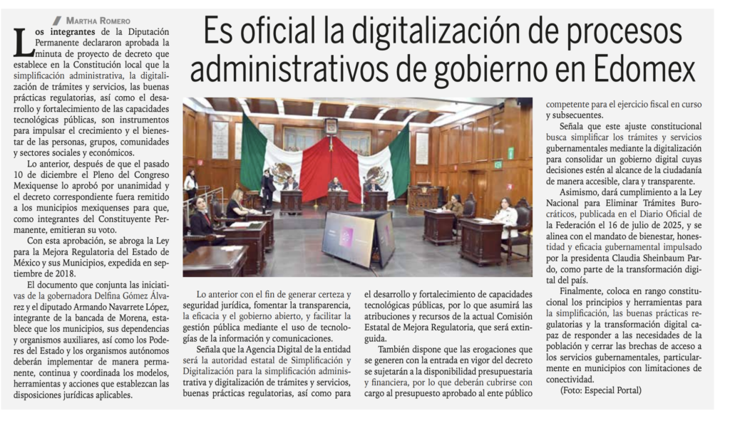- https://diarioportal.com/legislatura/es-oficial-la-digitalizacion-de-procesos-administrativos-de-gobierno-en-edomex?fbclid=IwY2xjawPTNFRicmlkETF1R0gzSkZ4Wnp2UHhNZHNOc3J0YwZhcHBfaWQQMjIyMDM5MTc4ODIwMDg5MgABHsGMfzUsPOf0U-VUQSwQp1azhDO4nuFgVZzFBRruOX71NxMKkb75WRD9qkfG&brid=3mTe2_kC05Op9b_kdA_ruA
