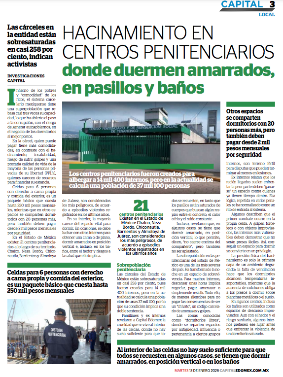 Infierno de los pobres y “comodidad” de los ricos, el sistema carcelario mexiquense tiene una superpoblación que rebasa casi tres veces su capacidad, lo que ha abierto el paso a la corrupción, con el riesgo de generar autogobiernos, en el negocio de los dormitorios al mejor postor.