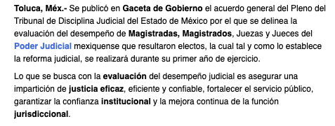 Se publicó en Gaceta de Gobierno el acuerdo general del Pleno del Tribunal de Disciplina Judicial del Estado de México por el que se delinea la evaluación del desempeño de Magistradas, Magistrados, Juezas y Jueces del Poder Judicial mexiquense que resultaron electos, la cial tal y como lo establece la reforma judicial, se realizará durante su primer año de ejercicio.
