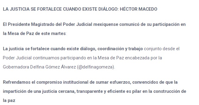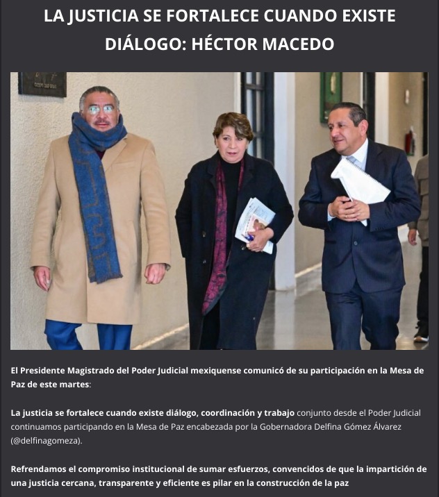 La justicia se fortalece cuando existe diálogo, coordinación y trabajo conjunto desde el Poder Judicial continuamos participando en la Mesa de Paz encabezada por la Gobernadora Delfina Gómez Álvarez (@delfinagomeza).