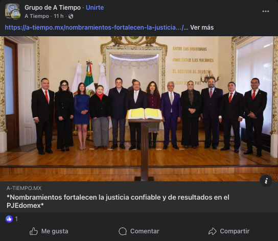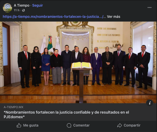 • https://a-tiempo.mx/nombramientos-fortalecen-la-justicia-confiable-y-de-resultados-en-el-pjedomex/?fbclid=IwY2xjawPUcDNleHRuA2FlbQIxMQBicmlkETFUcEd5RlcwNUpPNGF3ZUJmc3J0YwZhcHBfaWQQMjIyMDM5MTc4ODIwMDg5MgABHlmAGGkE0EXx3V8vXG___9tomnFHJIAsETEcinxQT6k9V3s223KkxN3qKsXX_aem__3vxHN3urN7a_gMz4AAk6A