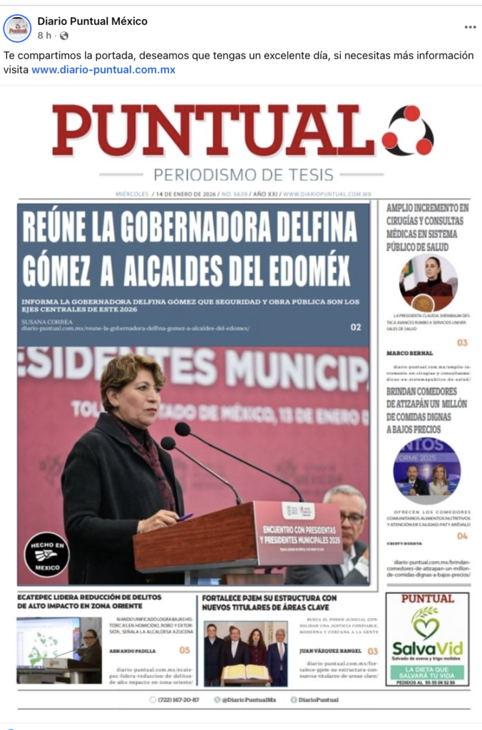 • https://www.facebook.com/DiarioPuntualMx/posts/pfbid02Ma48FrESwBwFGeoYdRi2ug53rvt3hn7Jc2PgQig5m7XXZSKiNpSphWHUbR6fJrLWl