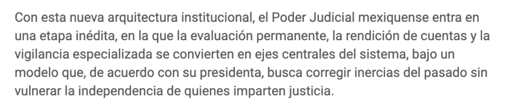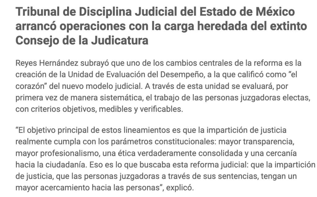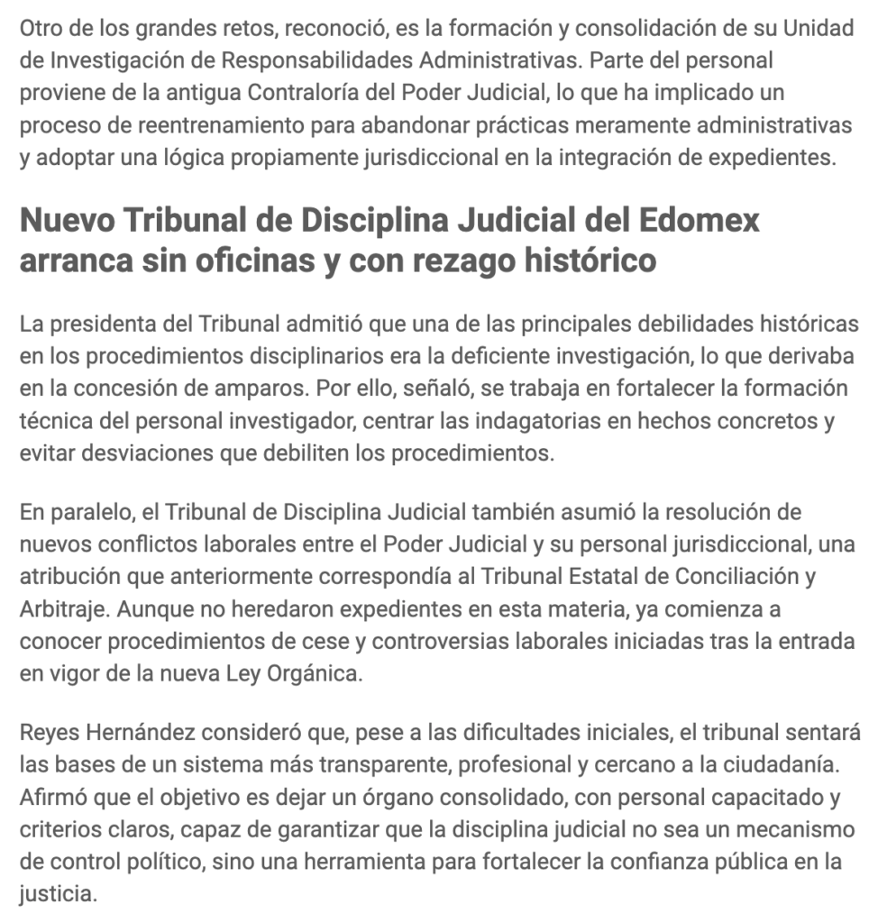 A poco más de cuatro meses de su instalación, el Tribunal de Disciplina Judicial del Estado de México avanza en la construcción de un nuevo modelo de vigilancia, evaluación y control del desempeño de magistradas, magistrados, juezas y jueces, surgido a partir de la reforma al Poder Judicial que extinguió al Consejo de la Judicatura y separó las funciones administrativas de las disciplinarias.