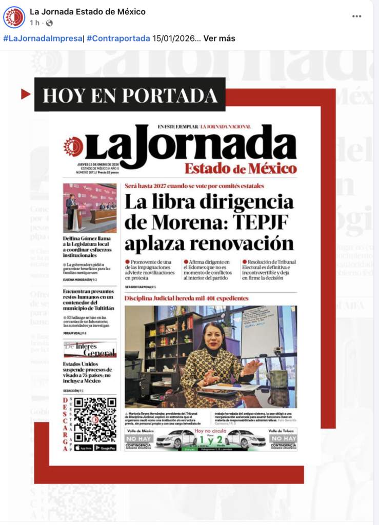 • https://www.facebook.com/LaJornadaEdoMEx/posts/pfbid0SZMVeQhoJJNZjikZChJYjNVdKY7uWfVaiSzkXmzGrr8KYztfXT7GXcmAGFaeRtYel