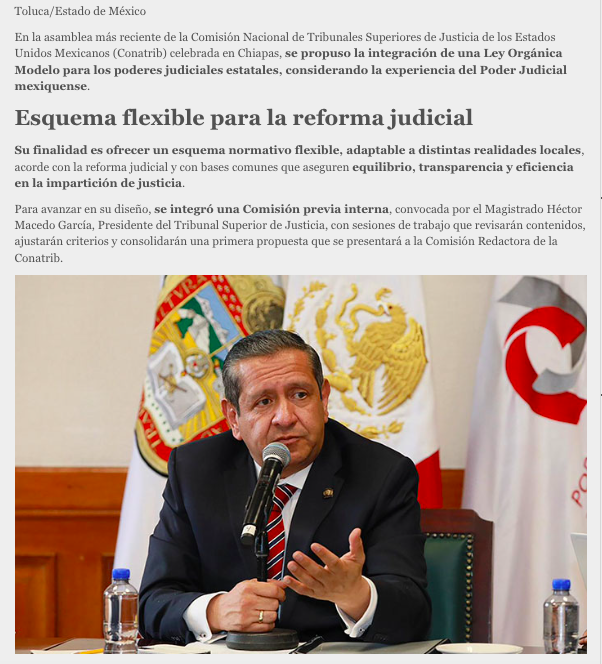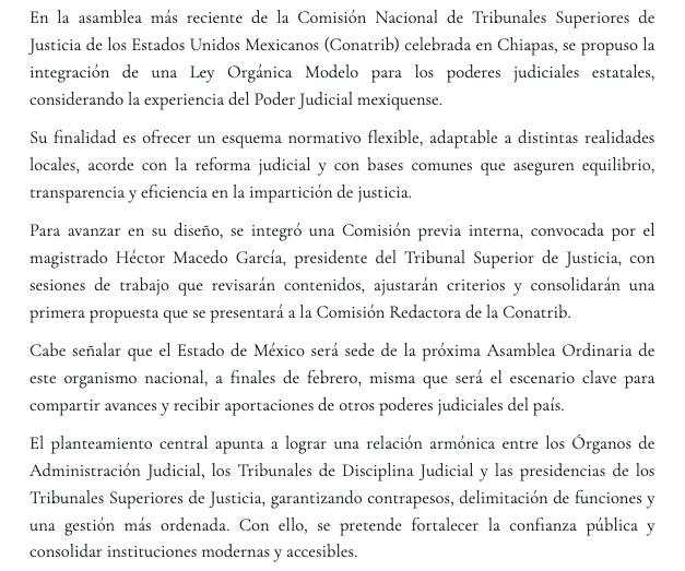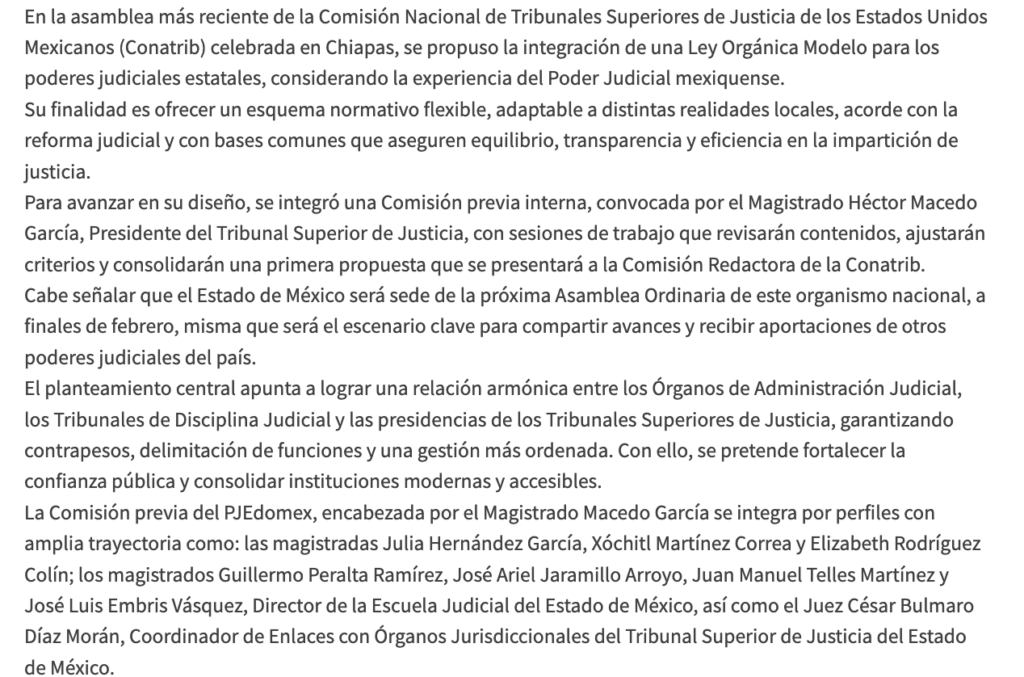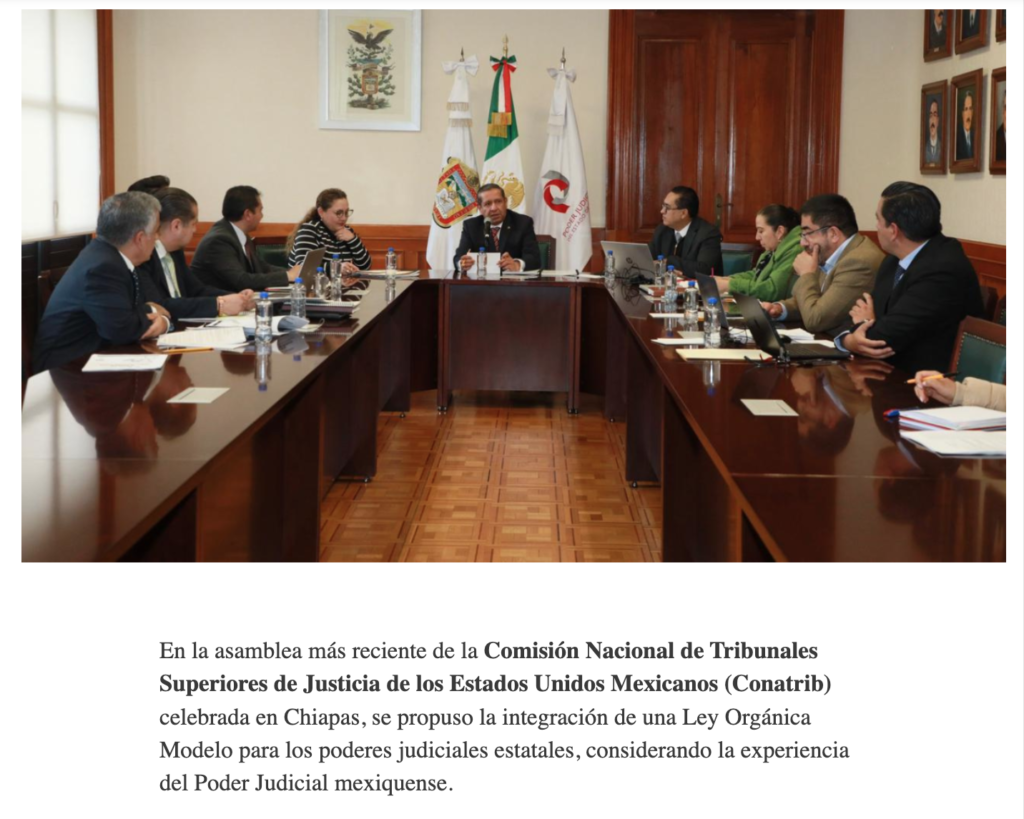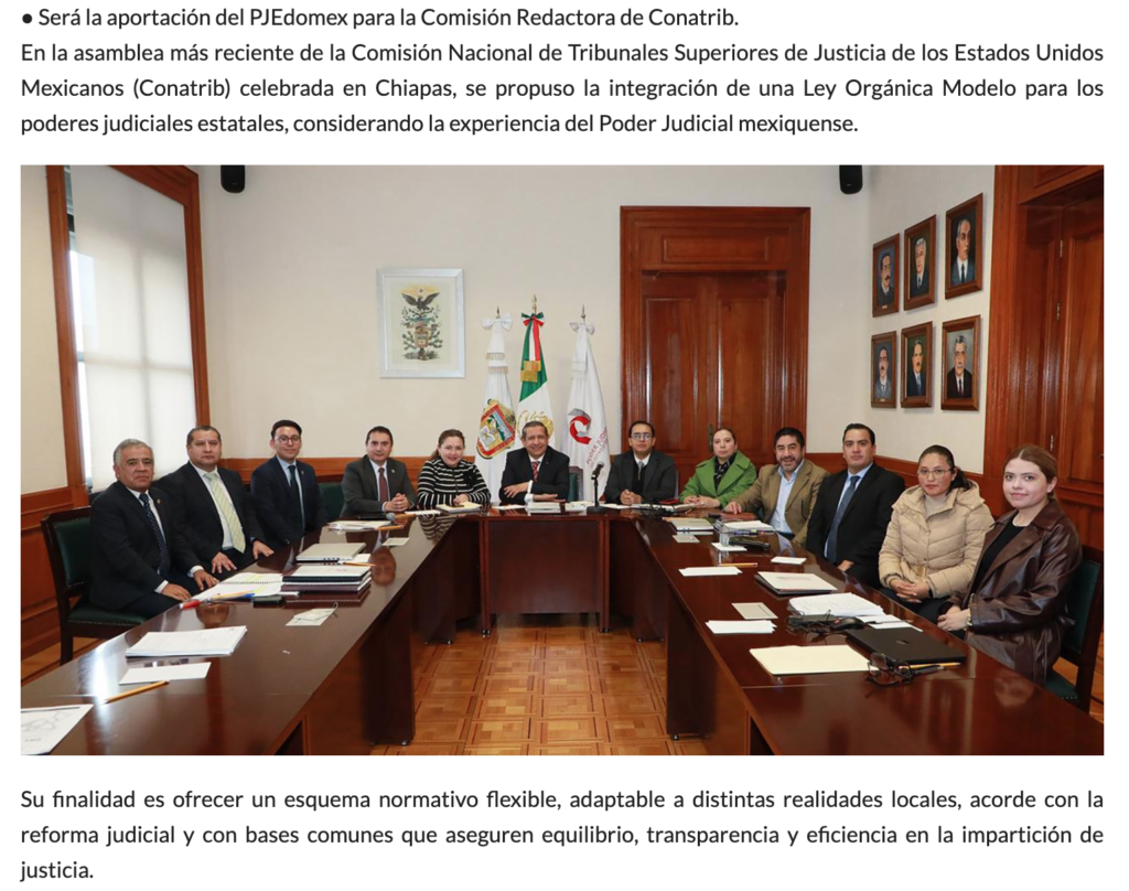 En la asamblea más reciente de la Comisión Nacional de Tribunales Superiores de Justicia de los Estados Unidos Mexicanos (Conatrib) celebrada en Chiapas, se propuso la integración de una Ley Orgánica Modelo para los poderes judiciales estatales, considerando la experiencia del Poder Judicial mexiquense.