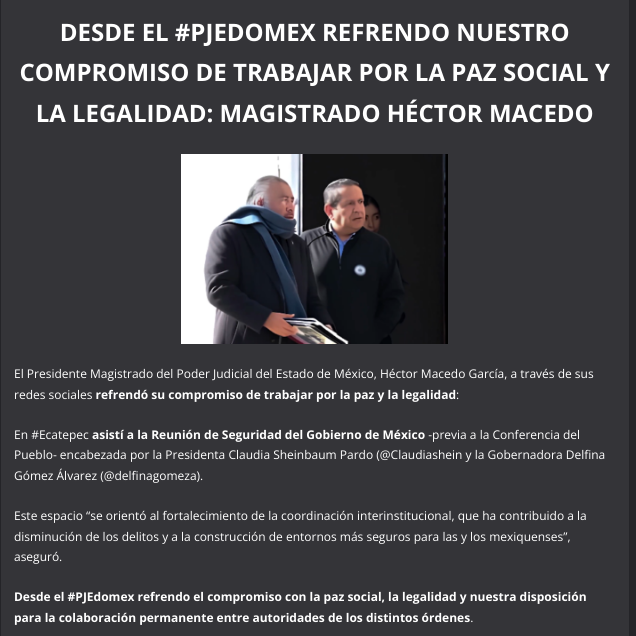 Desde el #PJEdomex refrendo el compromiso con la paz social, la legalidad y nuestra disposición para la colaboración permanente entre autoridades de los distintos órdenes.
