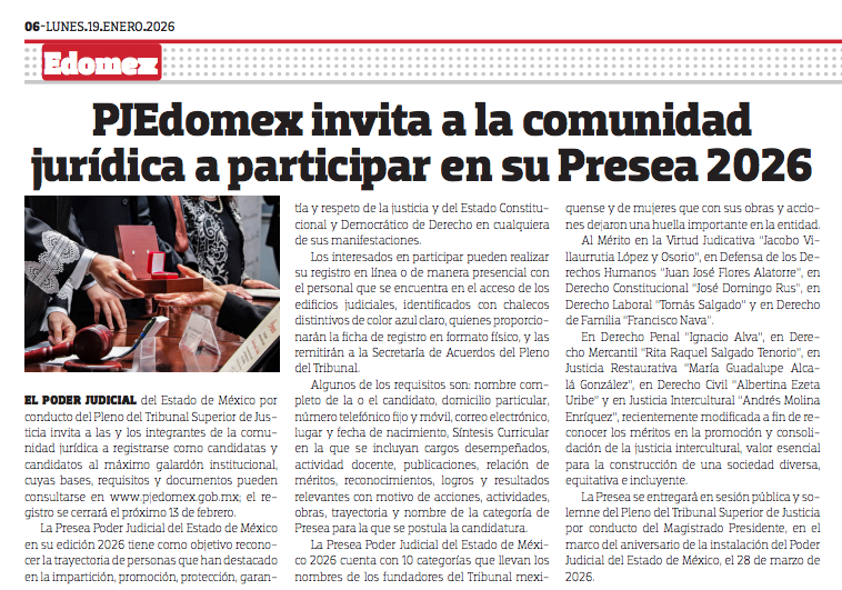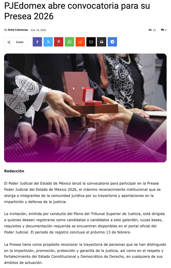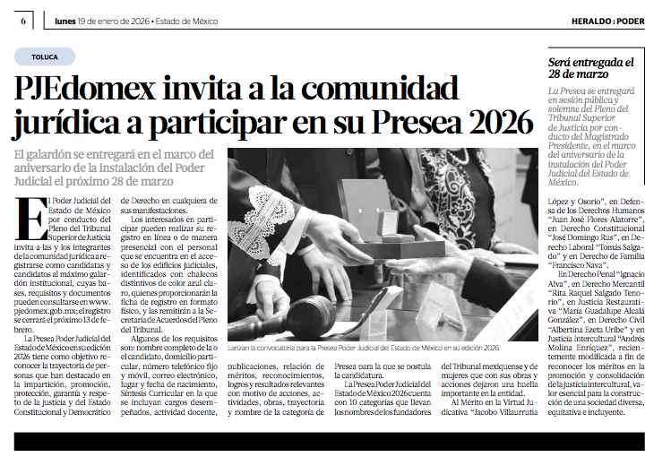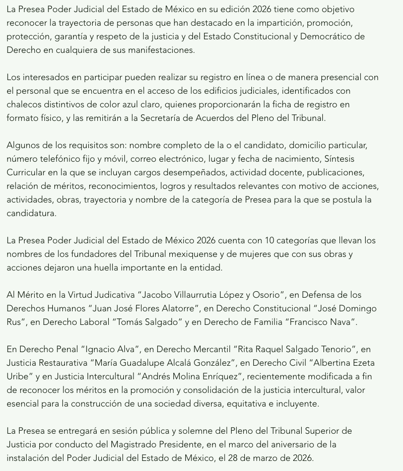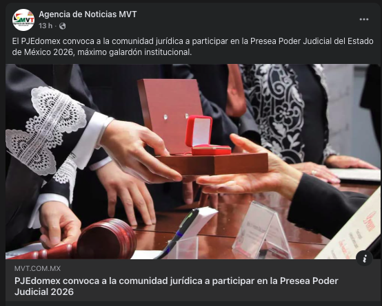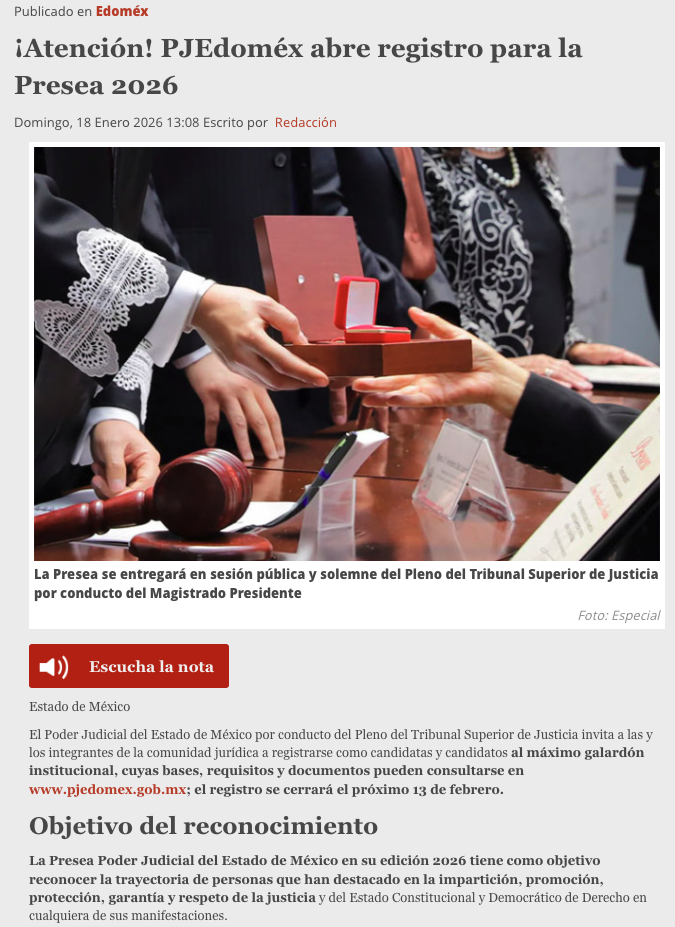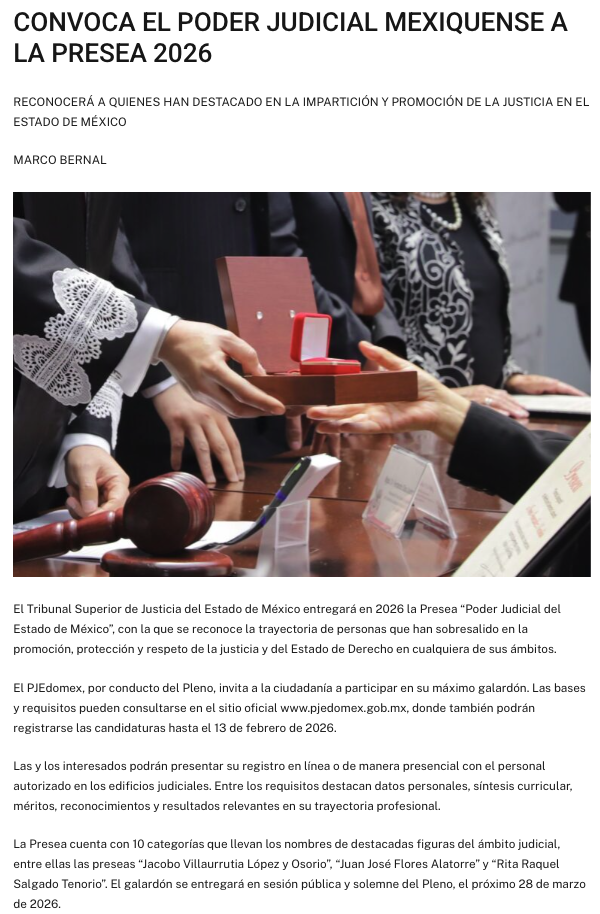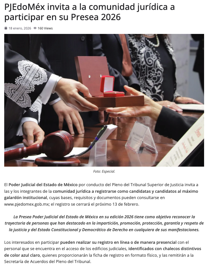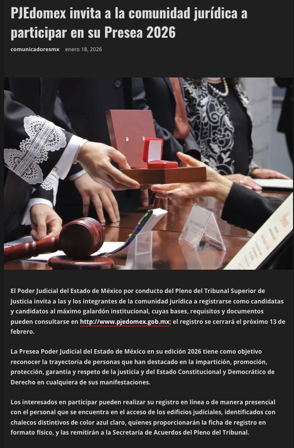 - https://mvt.com.mx/pjedomex-convoca-a-la-comunidad-juridica-a-participar-en-la-presea-poder-judicial-2026/