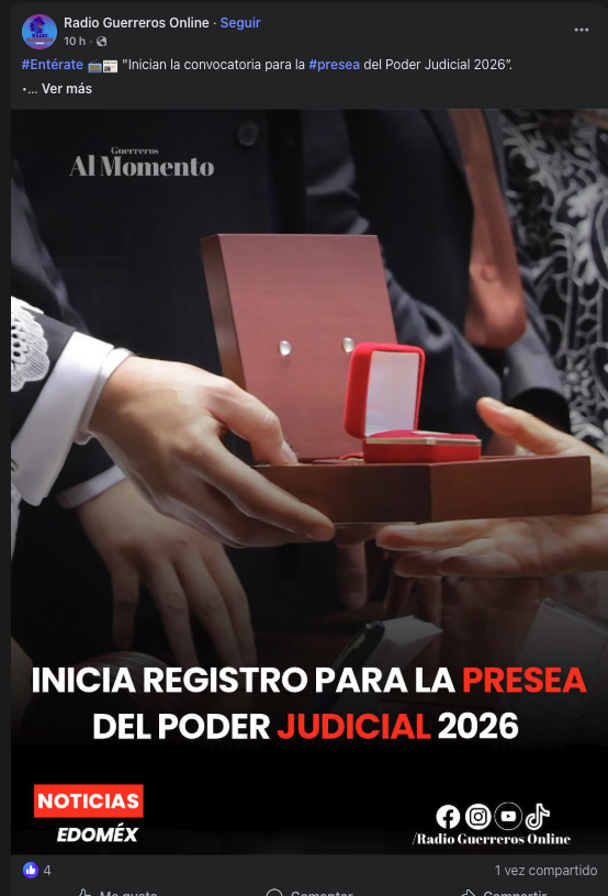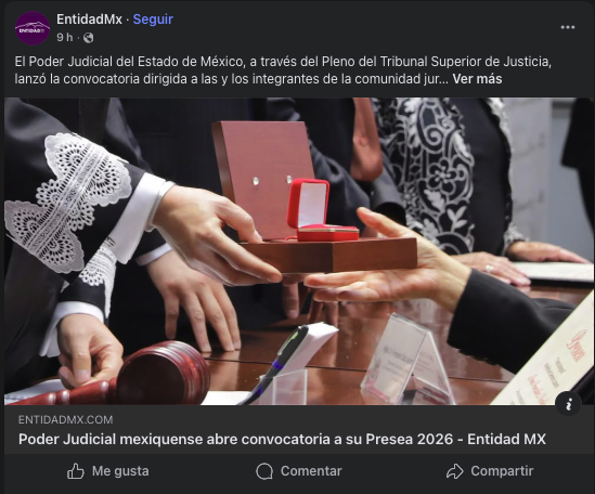- https://entidadmx.com/2026/01/18/poder-judicial-mexiquense-abre-convocatoria-a-su-presea-2026/?fbclid=IwY2xjawPbB11leHRuA2FlbQIxMQBicmlkETFxRjZGMnFRMmlaQ1k0MTZOc3J0YwZhcHBfaWQQMjIyMDM5MTc4ODIwMDg5MgABHo2ZpYXgqPCBMm26k2q7lMkGBzg3b0CwWrziGF0XqYrQ2PoDADkHEX5vHUlU_aem_QxnkMYw36TJEwyD9tOcUCw