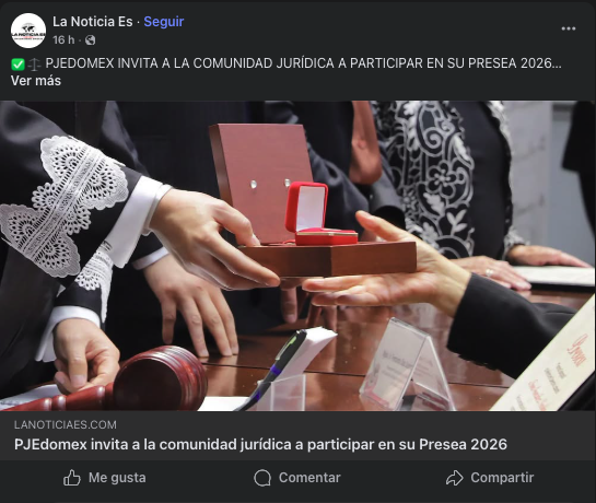 - https://www.lanoticiaes.com/post/pjedomex-invita-a-la-comunidad-jur%C3%ADdica-a-participar-en-su-presea-2026?fbclid=IwY2xjawPbBodleHRuA2FlbQIxMQBicmlkETFxRjZGMnFRMmlaQ1k0MTZOc3J0YwZhcHBfaWQQMjIyMDM5MTc4ODIwMDg5MgABHqT6m1vZF9DFSkIgoEBncsUHxy_acojGvVVu2-MFCQErTwIOulWhAWTY7PS4_aem_vwg0FQbjzO9v8XftvUZtpQ