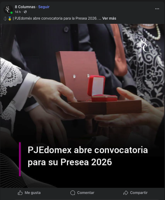 - https://comunicadores.mx/2026/01/18/pjedomex-invita-a-la-comunidad-juridica-a-participar-en-su-presea-2026/?fbclid=IwY2xjawPbBhhleHRuA2FlbQIxMQBicmlkETFxRjZGMnFRMmlaQ1k0MTZOc3J0YwZhcHBfaWQQMjIyMDM5MTc4ODIwMDg5MgABHiZhTwZYRL1fepH6rHl4eCtKxZnWPc2HKkca-L5wUTHlzetKsMlr8e_cMurE_aem_lhyJb6pMPbzjAXguhjSTrA