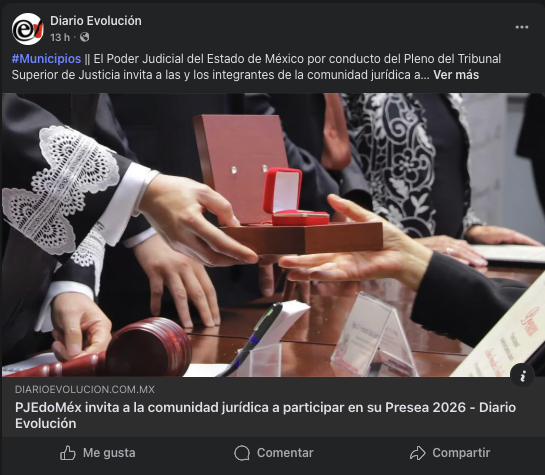 - https://www.diarioevolucion.com.mx/pjedomex-invita-a-la-comunidad-juridica-a-participar-en-su-presea-2026/?fbclid=IwY2xjawPbCIlleHRuA2FlbQIxMQBicmlkETFxRjZGMnFRMmlaQ1k0MTZOc3J0YwZhcHBfaWQQMjIyMDM5MTc4ODIwMDg5MgABHuLWI1jNuukzHSU5BxEjB3mWsCJvDondbYHAnWe-YVMxX1vp8OQeYiHVfK_V_aem_N-sjrBWcNOmBreS6jGx27g