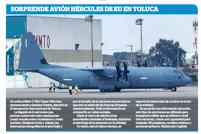 Un avión militar C-130J Súper Hércules, perteneciente a Estados Unidos, aterrizó en el Aeropuerto Internacional de Toluca. La llegada de la aeronave que primero sobrevoló cielo mexiquense