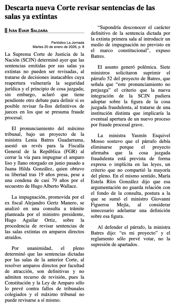 La Suprema Corte de Justicia de la Nación (SCJN) determinó ayer que las sentencias emitidas por sus salas ya extintas no pueden ser revisadas, al tratarse de decisiones inatacables cuya reapertura vulneraría la seguridad jurídica y el principio de cosa juzgada; sin embargo, aclaró que tiene pendiente otro debate para definir si es posible revisar fa-llos definitivos de jueces en los que se presuma fraude procesal.
