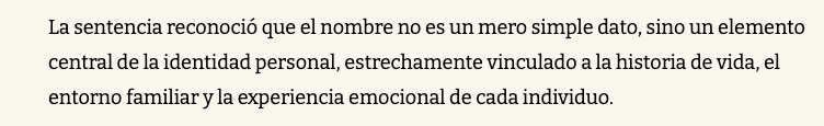 La sentencia reconoció que el nombre no es un mero simple dato, sino un elemento central de la identidad personal, estrechamente vinculado a la historia de vida, el entorno familiar y la experiencia emocional de cada individuo.