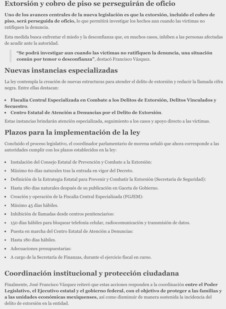 El legislador precisó que la extorsión seguirá castigándose conforme a la ley general en la materia, en armonía con el nuevo marco federal, y que la entidad contará con herramientas locales para combatirla de manera eficaz.