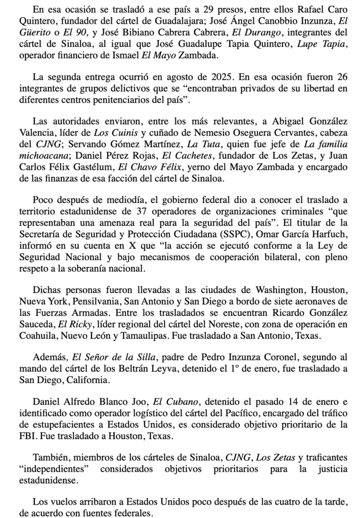 El gobierno mexicano entregó ayer a Estados Unidos a 37 narcotraficantes. Por primera ocasión en estos envíos masivos incluyó a una mujer: María del Rosario Navarro Sánchez, La Señora o La Chayo, identificada como integrante del cártel Jalisco Nueva Generación (CJNG), acusada de tráfico de armas y personas, delitos contra la salud y operaciones con recursos de procedencia ilícita.