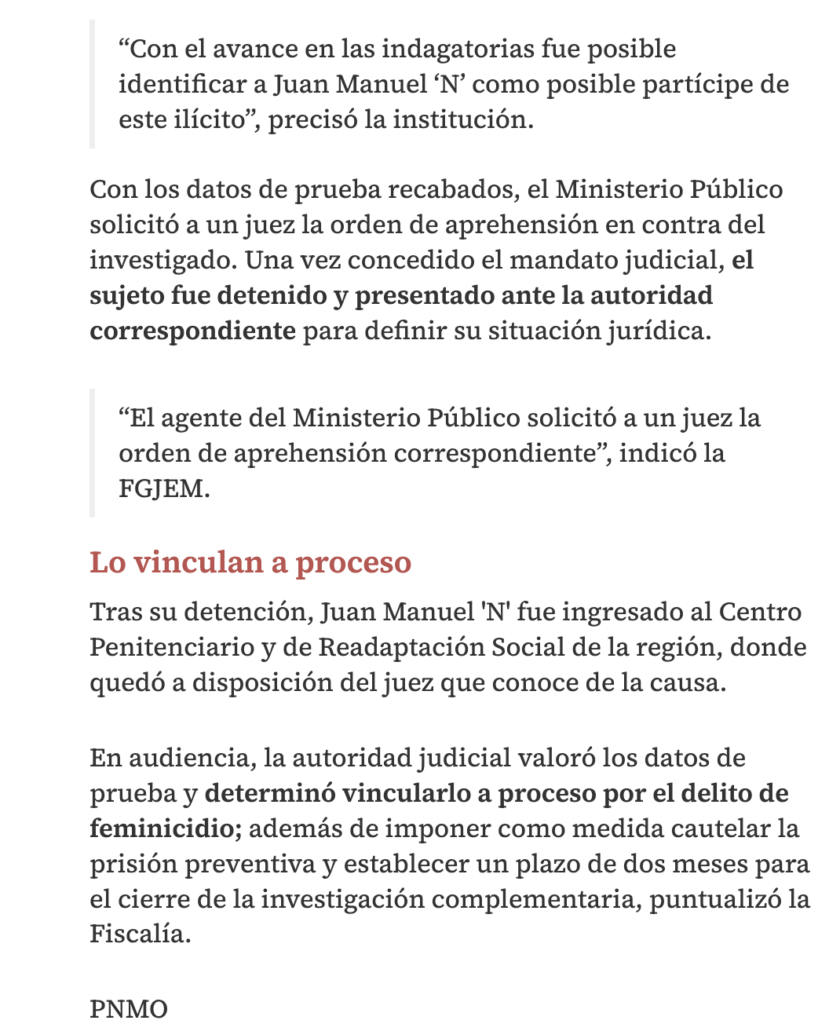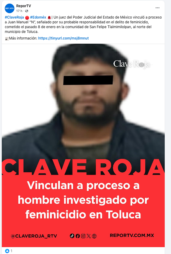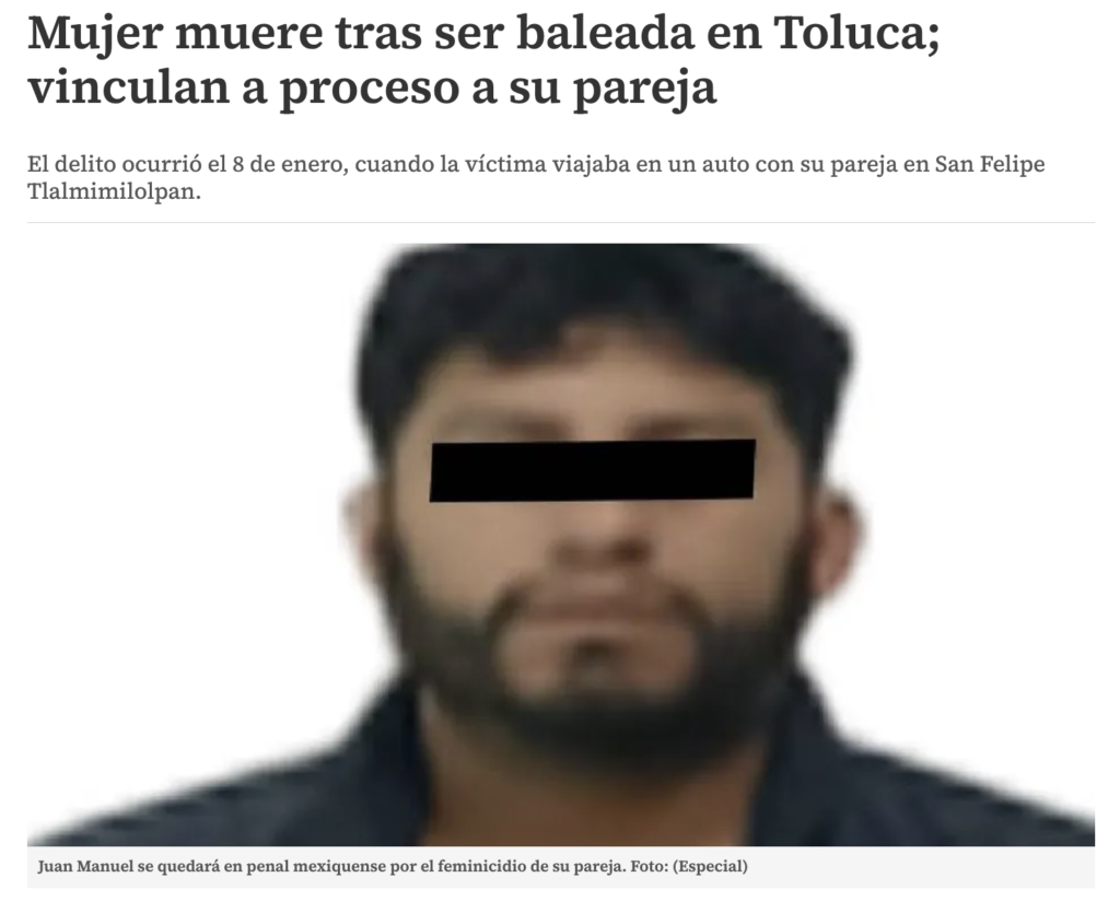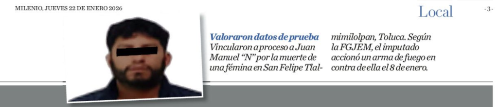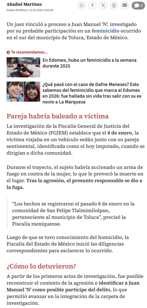 - https://reportv.com.mx/2026/01/21/vinculan-a-proceso-a-hombre-investigado-por-feminicidio-en-toluca/?fbclid=IwY2xjawPfH05leHRuA2FlbQIxMABicmlkETF0RkliQWxjUERhWEFRVklwc3J0YwZhcHBfaWQQMjIyMDM5MTc4ODIwMDg5MgABHgp25G3Hic_drYeIhWwm0bjjHiv2ltFIQ1smDDlAjyxlvGYqmWzTrYbKEQwq_aem_BQ8dzpbTHjzptNa2hrxXXg