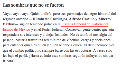Vaya, vaya, vaya. Quién lo diría, pero tres personajes de negro historial del régimen anterior —Humberto CastillejosAlfredo Castillo y Alberto Bazbaz— siguen teniendo pulso en la Fiscalía General de Justicia del Estado de México y en el Poder Judicial. Conservan gente dentro que aún responde a sus intereses y a viejas lealtades. No es teoría ni nostalgia del pasado: bastaría trazar una red mínima de vínculos, cargos y decisiones para entender quién es quién y quién le debe a quién. El dato incómodo es que el cambio político no siempre barre con las estructuras. A veces solo les baja el perfil. ¿Hasta cuándo esas sombras seguirán influyendo sin dar la cara?