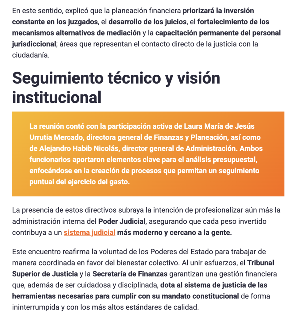 Este encuentro permitió establecer una comunicación directa y permanente en el ámbito financiero, así como presentar a la y el nuevo director, y fortalecer el vínculo con las subsecretarías, a fin de eficientar los recursos y apegarnos a los principios de un gasto responsable y austero, sin que implique dejar de invertir en la función sustancial del Poder Judicial: los juzgados, los juicios, la mediación y la capacitación.
