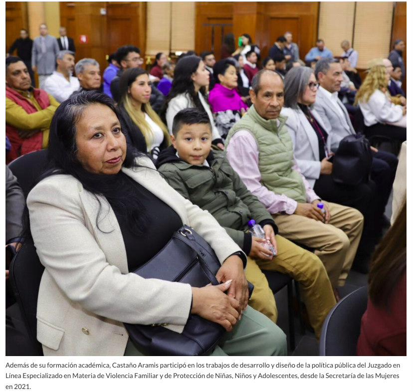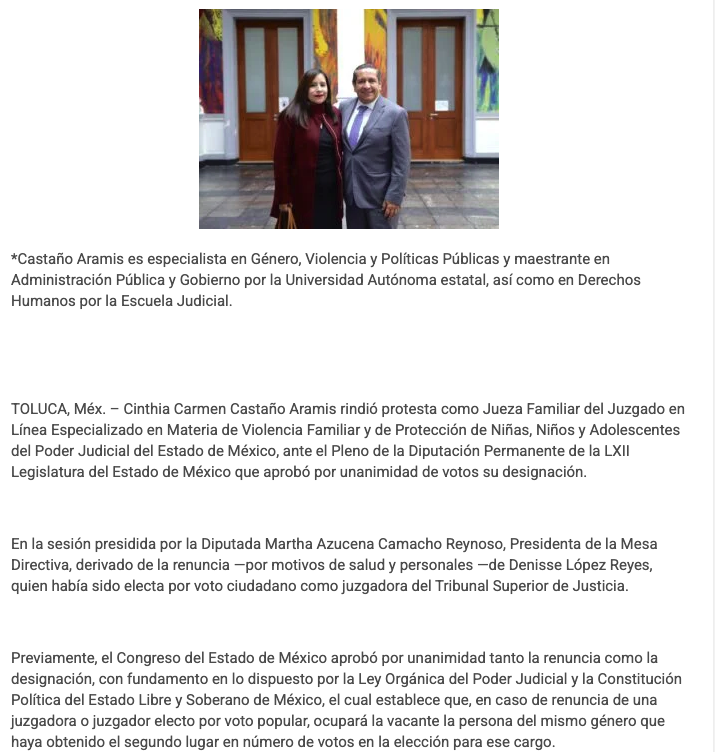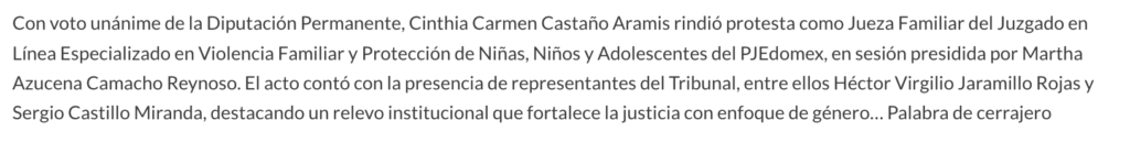 Cinthia Carmen Castaño Aramis rindió protesta como Jueza Familiar del Juzgado en Línea Especializado en Materia de Violencia Familiar y de Protección de Niñas, Niños y Adolescentes del Poder Judicial del Estado de México, ante el Pleno de la Diputación Permanente de la LXII Legislatura del Estado de México que aprobó por unanimidad de votos su designación.