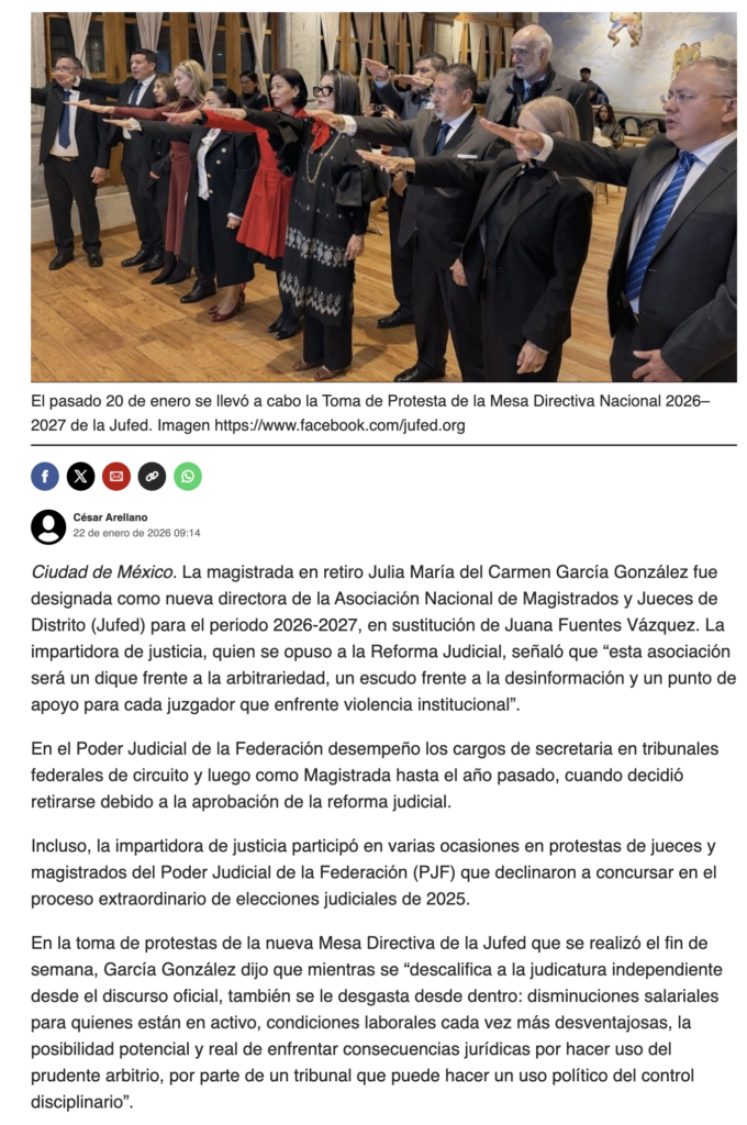 La magistrada en retiro Julia María del Carmen García González fue designada como nueva directora de la Asociación Nacional de Magistrados y Jueces de Distrito (Jufed) para el periodo 2026-2027, en sustitución de Juana Fuentes Vázquez. La impartidora de justicia, quien se opuso a la Reforma Judicial, señaló que “esta asociación será un dique frente a la arbitrariedad, un escudo frente a la desinformación y un punto de apoyo para cada juzgador que enfrente violencia institucional”.