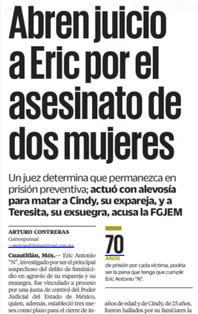 - https://www.eluniversal.com.mx/metropoli/doble-feminicidio-en-cuautitlan-vinculan-a-proceso-a-eric-antonio-n-por-muerte-de-cindy-y-teresita/