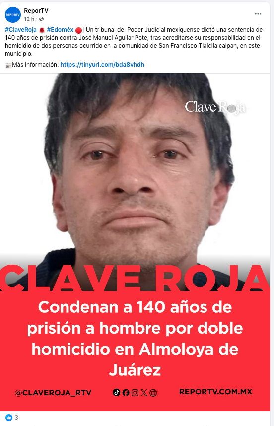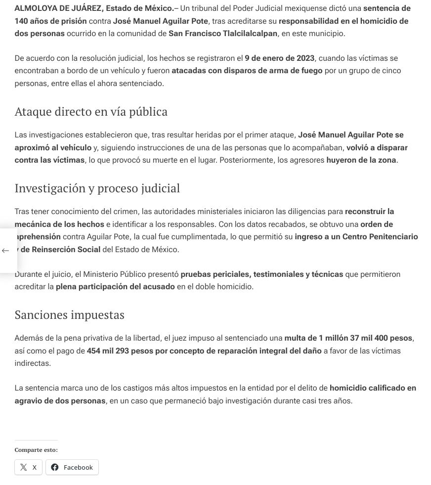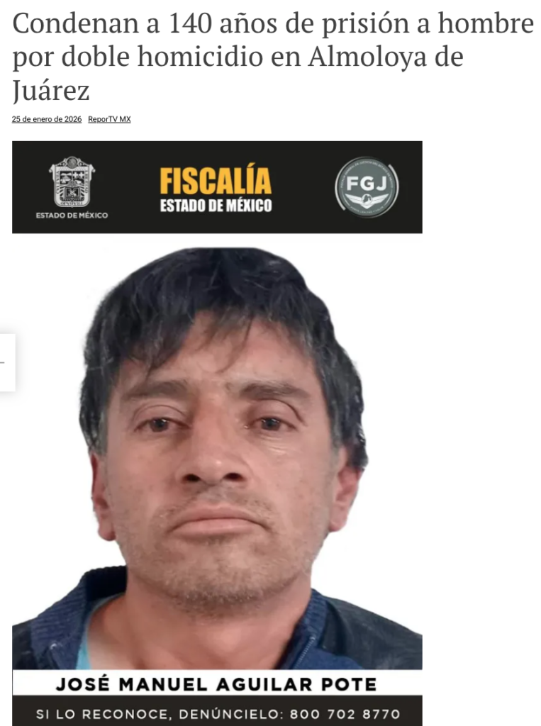 - https://reportv.com.mx/2026/01/25/condenan-a-140-anos-de-prision-a-hombre-por-doble-homicidio-en-almoloya-de-juarez/?fbclid=IwY2xjawPkYiJleHRuA2FlbQIxMABicmlkETFSRDhNaHBqWWZ3WlN3ejJQc3J0YwZhcHBfaWQQMjIyMDM5MTc4ODIwMDg5MgABHo8zAJOHh97T9eu-E6MeAOyvwr4Nf4WY3Dn_IaKqzOzrByhA_bXrfvDkMTAf_aem_i_mF3KRXEv3pwu7PSWDrZQ