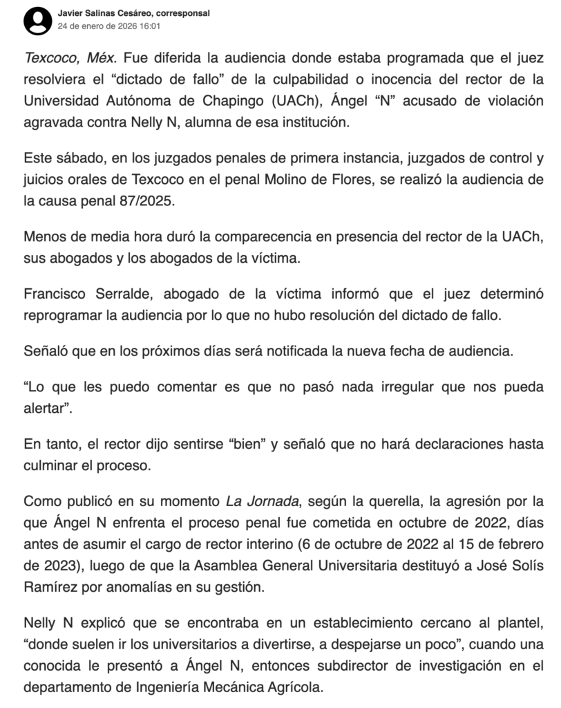 - https://www.jornada.com.mx/noticia/2026/01/24/estados/difieren-audiencia-de-fallo-del-rector-de-la-universidad-de-chapingo-en-caso-de-violacion-contra-alumna