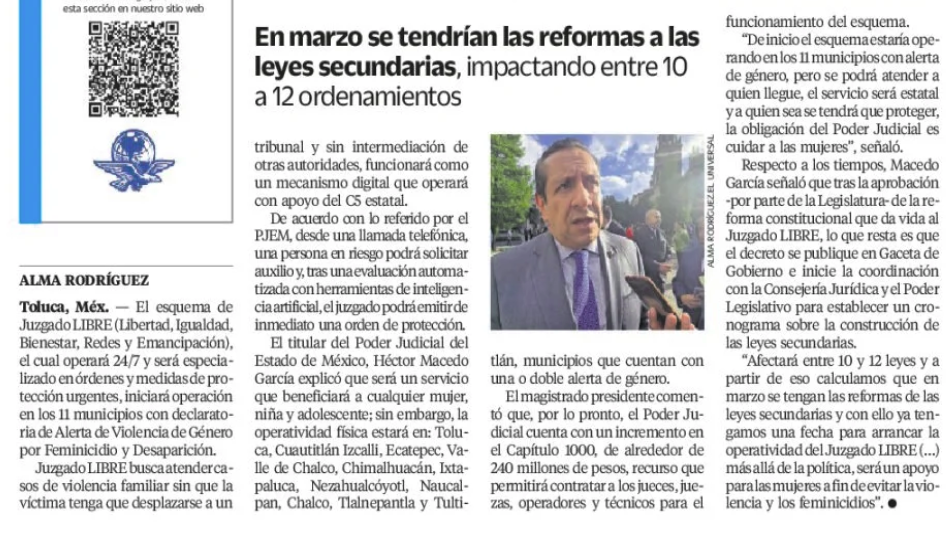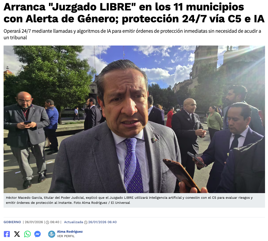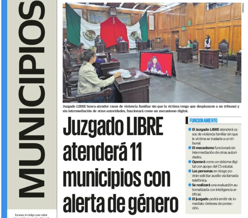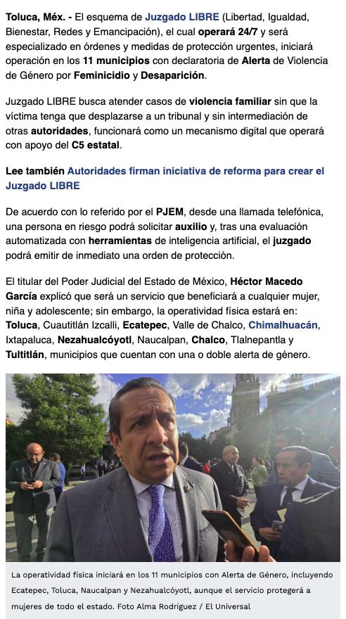 • https://www.eluniversaledomex.com.mx/gobierno/arranca-juzgado-libre-en-los-11-municipios-con-alerta-de-genero-proteccion-247-via-c5-e-ia/