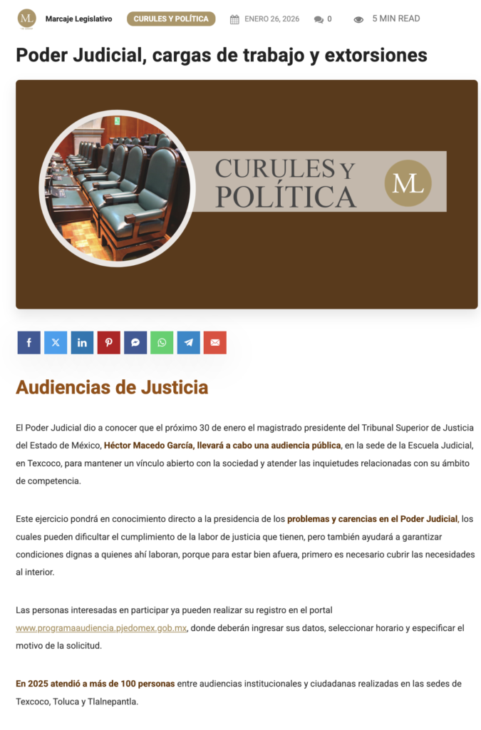 El Poder Judicial dio a conocer que el próximo 30 de enero el magistrado presidente del Tribunal Superior de Justicia del Estado de México, Héctor Macedo García, llevará a cabo una audiencia pública en la sede de la Escuela Judicial en Texcoco, para mantener un vínculo abierto con la sociedad y atender las inquietudes relacionadas con su ámbito de competencia.