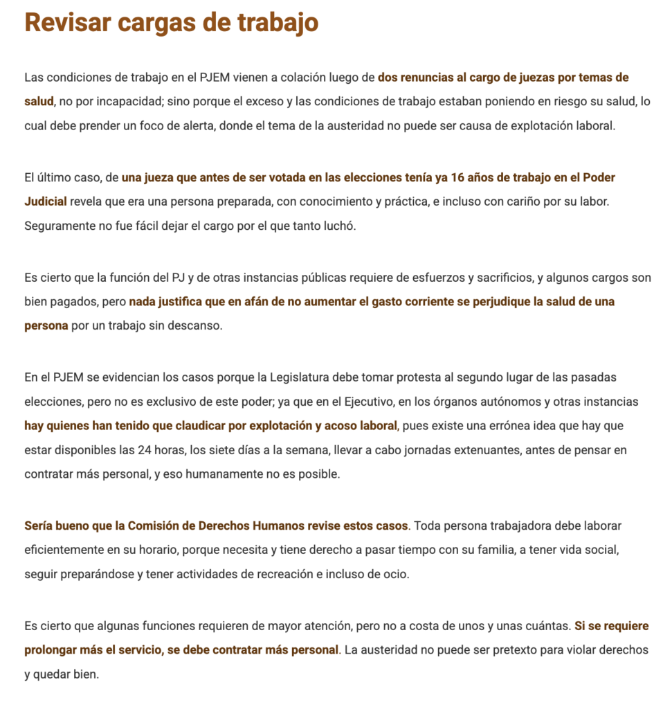 Las condiciones de Trabajo en el PJEM vienen a colación luego de dos renuncias al cargo de juezas por temas de salud, no por incapacidad, sino porque el exceso y las condiciones de trabajo estaban poniendo en riesgo su salud, lo cual debe prender un foco de alerta, donde el tema de austeridad no puede ser causa de explotación laboral.