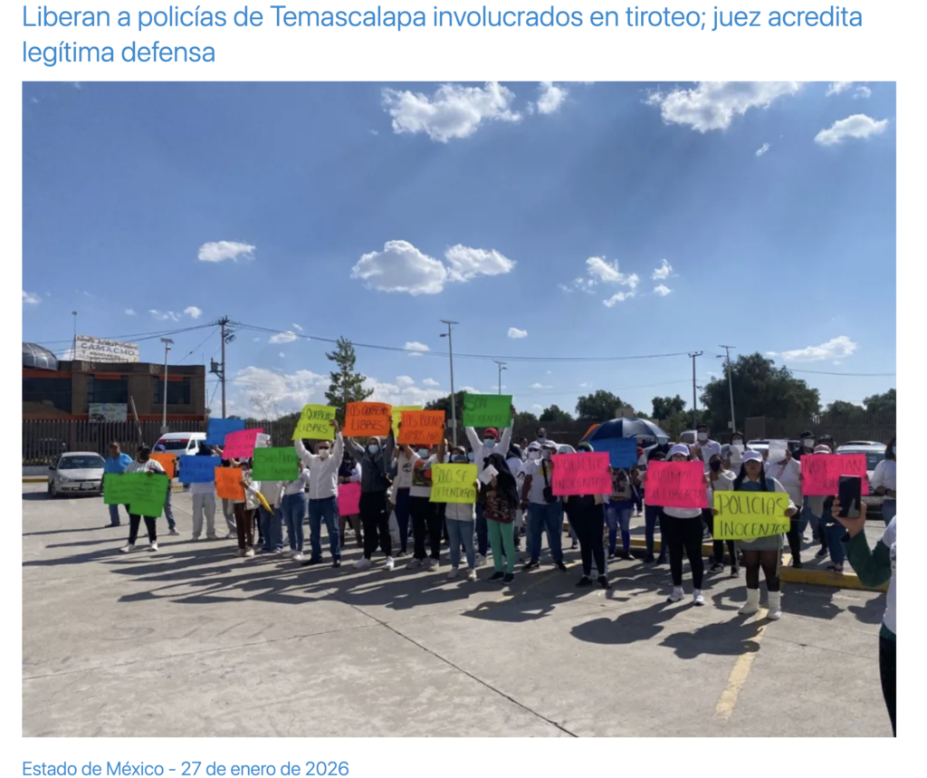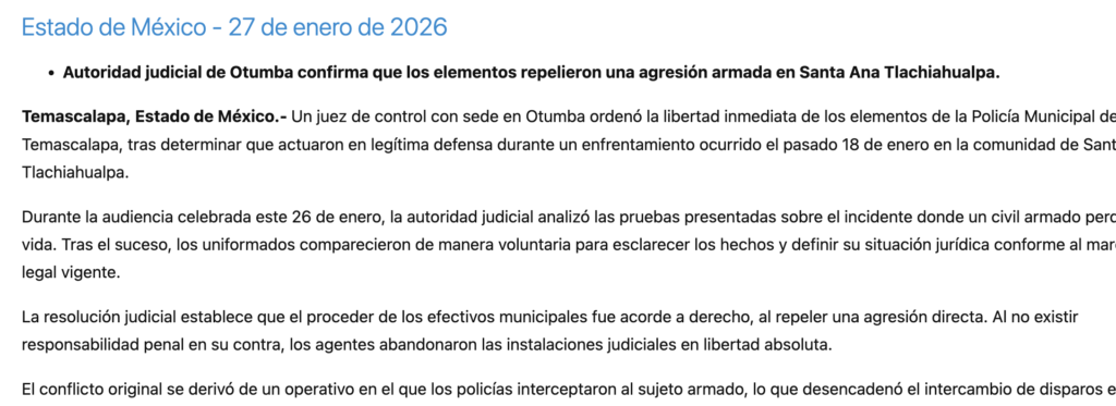 - https://www.agencianvm.com.mx/estado-de-mexico/liberan-a-policias-de-temascalapa-involucrados-en-tiroteo-juez-acredita-legitima-defensa.html