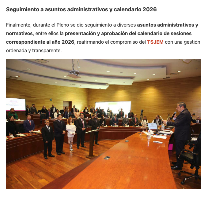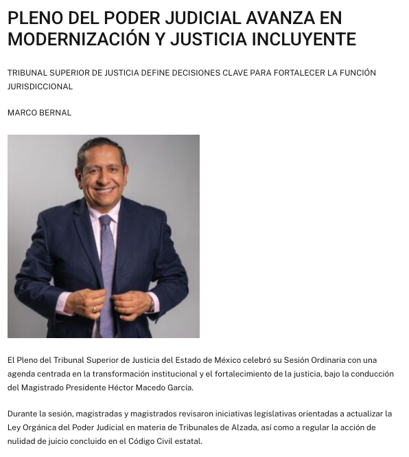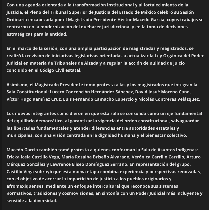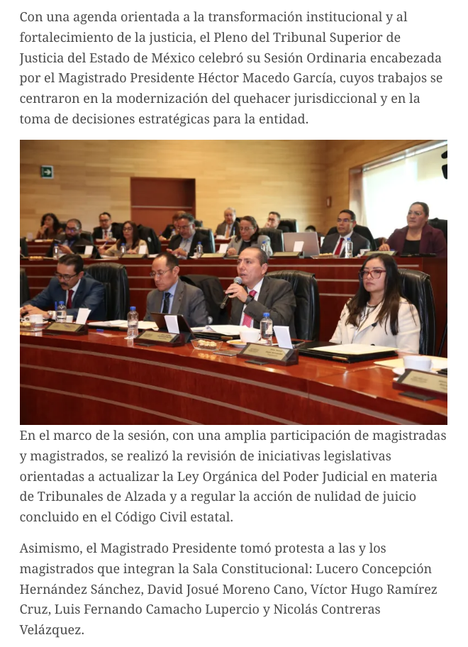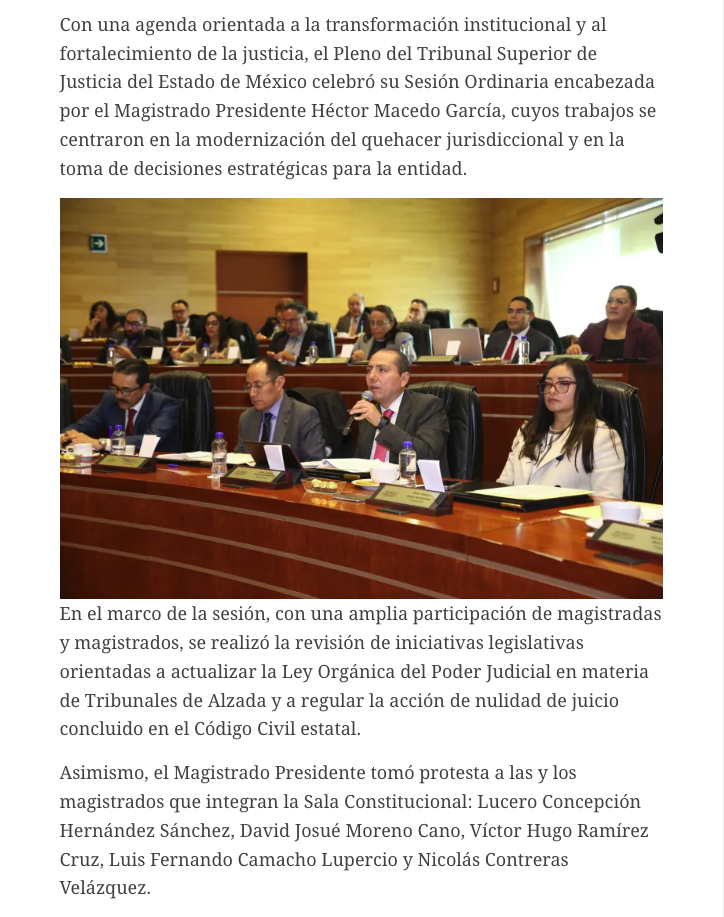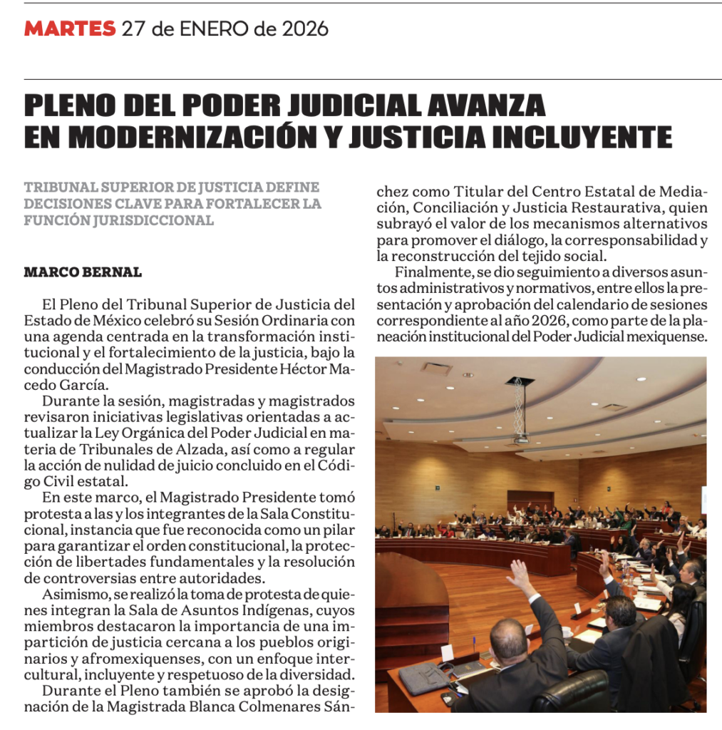 Con una agenda orientada a la transformación institucional y al fortalecimiento de la justicia, el Pleno del Tribunal Superior de Justicia del Estado de México celebró su Sesión Ordinaria encabezada por el Magistrado Presidente Héctor Macedo García, cuyos trabajos se centraron en la modernización del quehacer jurisdiccional y en la toma de decisiones estratégicas para la entidad.