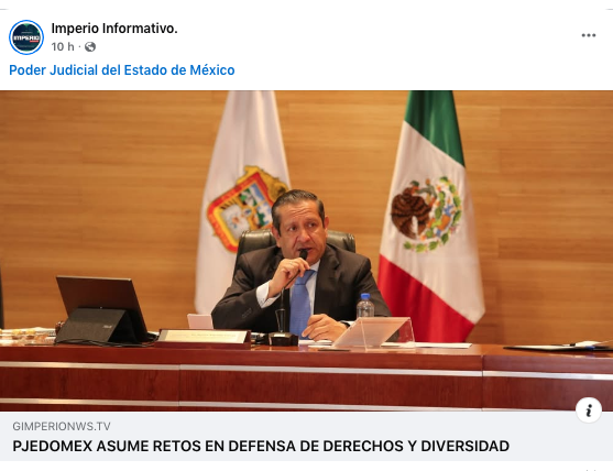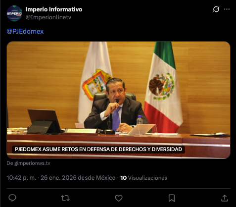 - https://gimperionws.tv/2026/01/26/pjedomex-asume-retos-en-defensa-de-derechos-y-diversidad/?fbclid=IwY2xjawPlt6pleHRuA2FlbQIxMQBzcnRjBmFwcF9pZBAyMjIwMzkxNzg4MjAwODkyAAEebQQliLRc1wqFoaVU5h2Gg9tvMDs9XYmq40SrZqaVH7mCdZlsK-Okb1opGMc_aem_hYGcKeBE50VoFPGLXzFmow