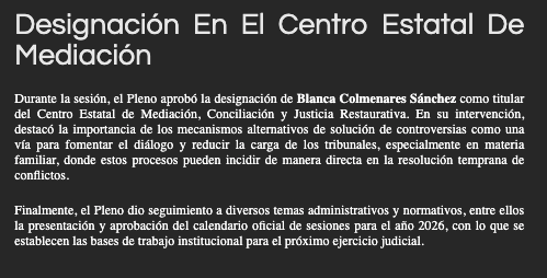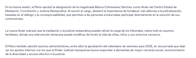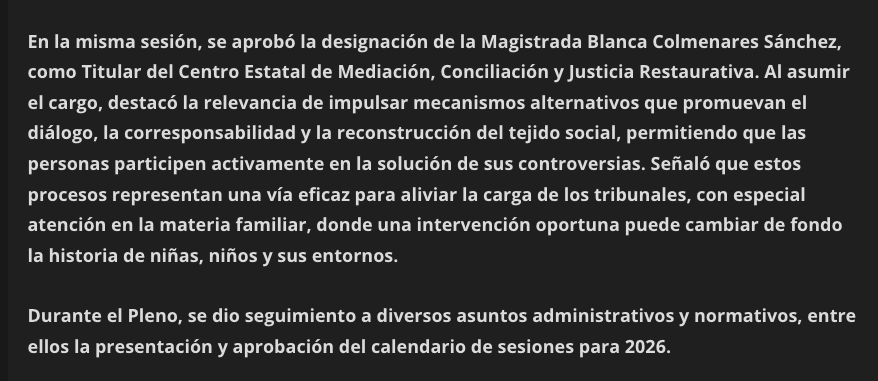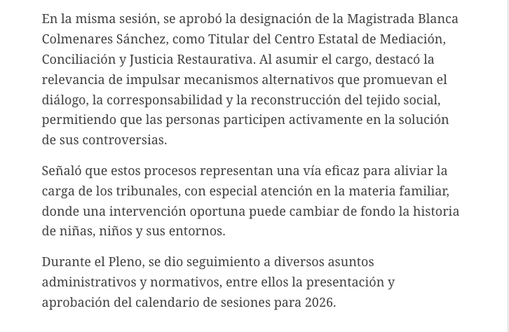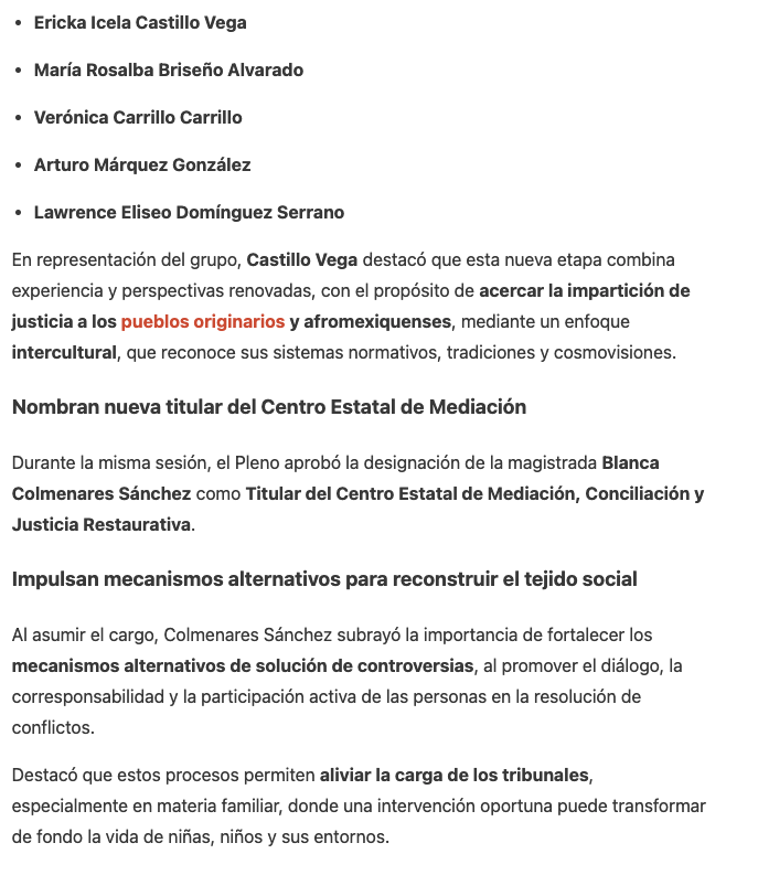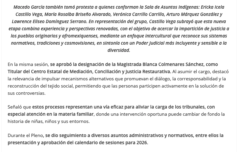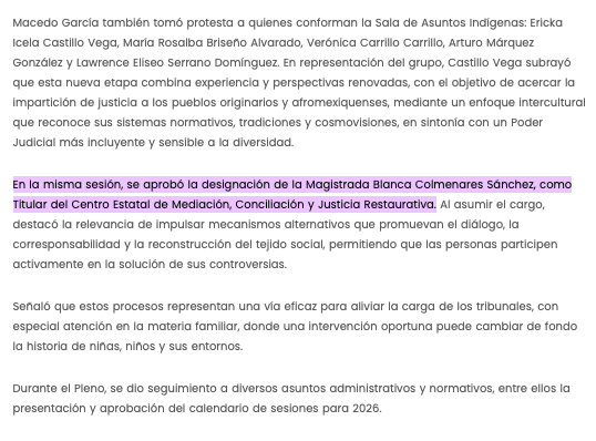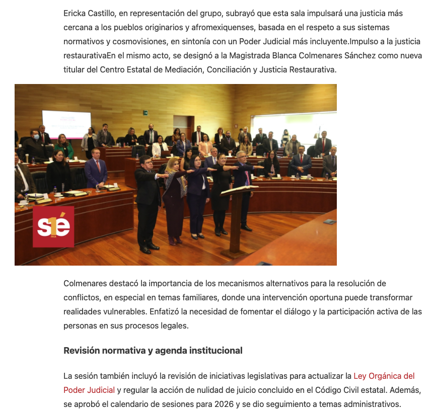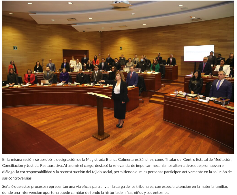 - https://elvalle.com.mx/2026/01/27/nueva-titular-del-centro-de-mediacion-e-integrantes-de-sala-constitucional-y-de-asuntos-indigenas/#:~:text=En%20la%20misma%20sesi%C3%B3n%2C%20se,Mediaci%C3%B3n%2C%20Conciliaci%C3%B3n%20y%20Justicia%20Restaurativa.