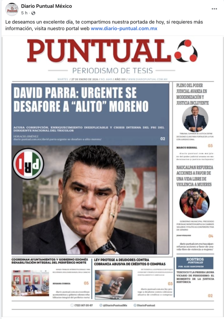 - https://www.facebook.com/DiarioPuntualMx/posts/pfbid02LcN8riqCafpP3NdnRdAtZypByNe1KS2e2RP1UuvtUkaX9HcWKQMd2D3ESLMuYazEl