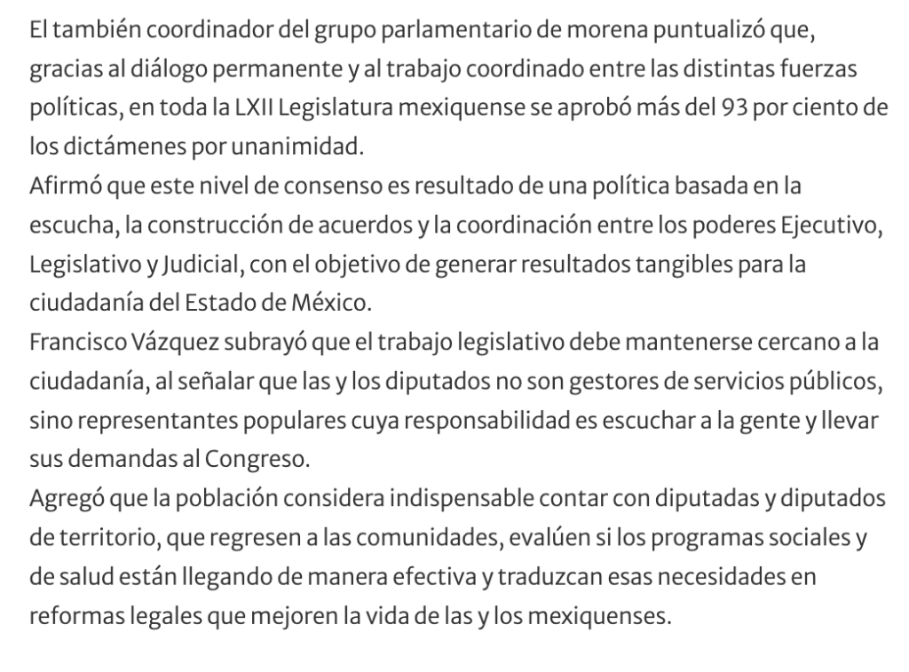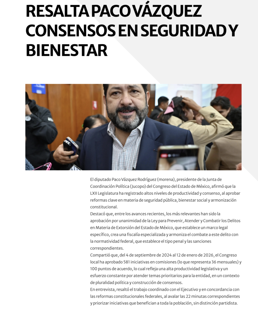 El diputado Paco Vázquez Rodríguez (morena), presidente de la Junta de Coordinación Política (Jucopo) del Congreso del Estado de México, afirmó que la LXII Legislatura ha registrado altos niveles de productividad y consenso, al aprobar reformas clave en materia de seguridad pública, bienestar social y armonización constitucional.