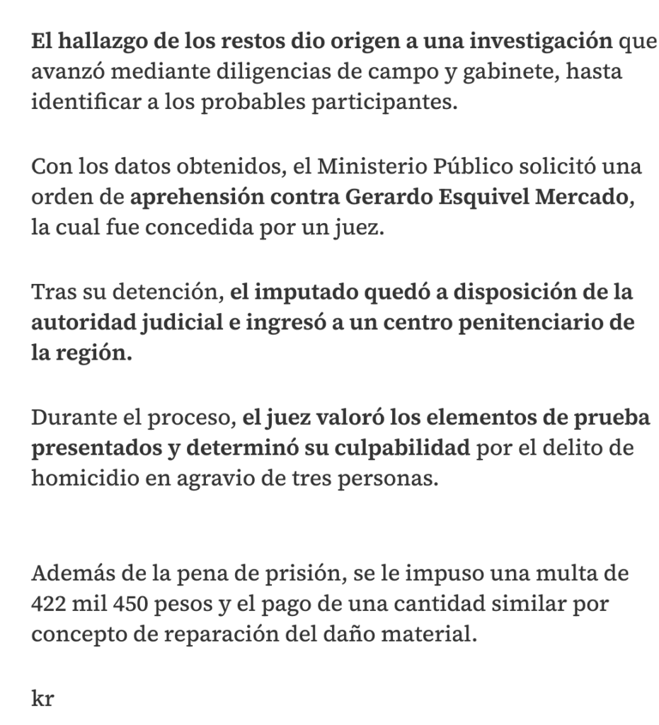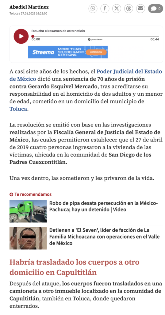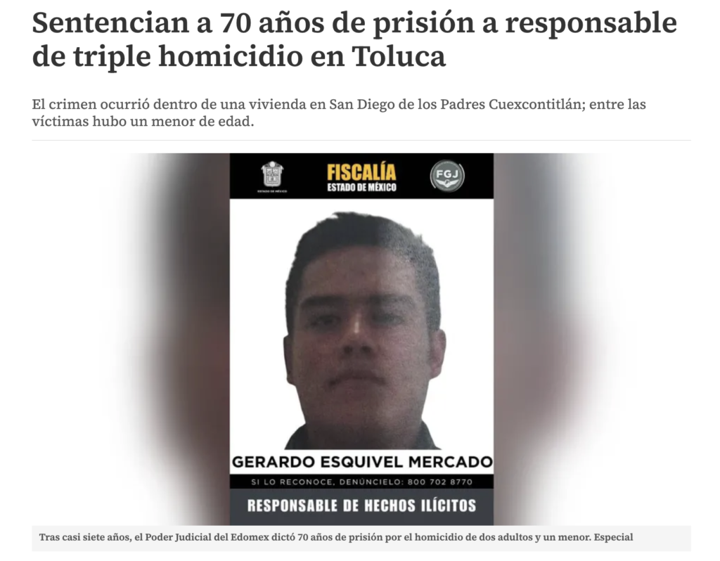 A casi siete años de los hechos, el Poder Judicial del Estado de México dictó una sentencia de 70 años de prisión contra Gerardo Esquivel Mercado, tras acreditarse su responsabilidad en el homicidio de dos adultos y un menor de edad, cometido en un domicilio del municipio de Toluca.