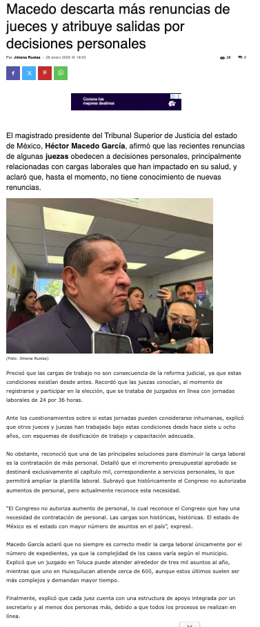 El magistrado presidente del Tribunal Superior de Justicia del estado de México, Héctor Macedo García, afirmó que las recientes renuncias de algunas juezas obedecen a decisiones personales, principalmente relacionadas con cargas laborales que han impactado en su salud, y aclaró que, hasta el momento, no tiene conocimiento de nuevas renuncias.