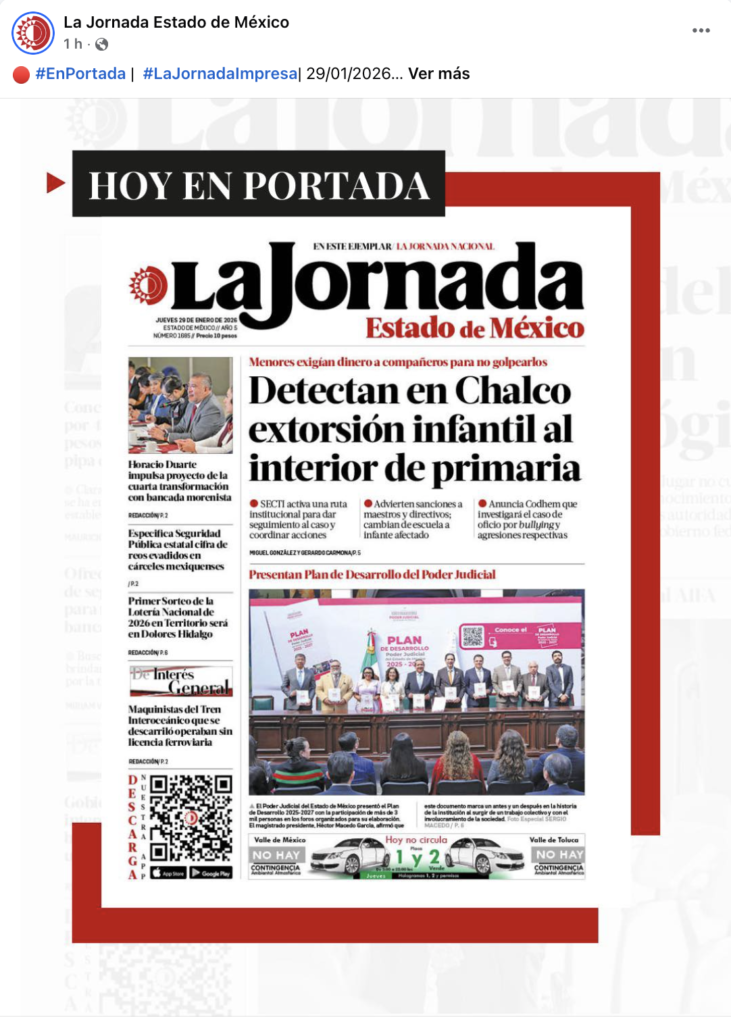 - https://www.facebook.com/LaJornadaEdoMEx/posts/pfbid0Wxuxg7wLdmcUYU4PHwF42zgxNZc2MUQokhzGxCEATASC4QEyKYtEzianwoGdyR6Rl