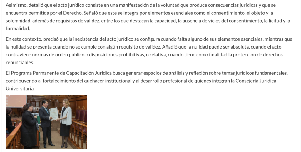 La Universidad Autónoma del Estado de México (UAEMéx), a través de la Consejería Jurídica Universitaria, llevó a cabo la primera sesión del Programa Permanente de Capacitación Jurídica, con la ponencia “Nulidad e inexistencia del acto jurídico”, impartida por el maestro en Derecho y magistrado en retiro del Poder Judicial del Estado de México, Patricio T. Sánchez Vértiz Ruiz.