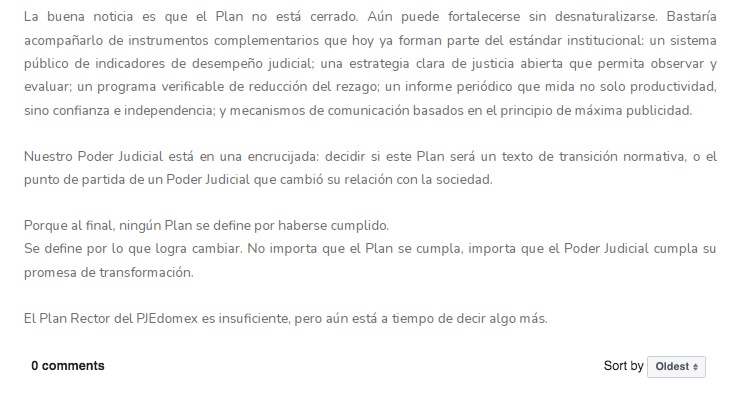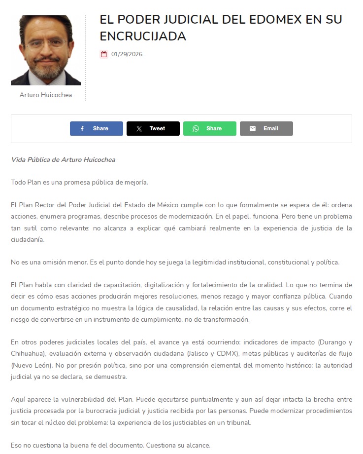 El Plan Rector del Poder Judicial del Estado de México cumple en lo formal, pero no explica con claridad cómo sus acciones mejorarán realmente la experiencia de justicia de la ciudadanía. Carece de una lógica de impacto que conecte capacitación, digitalización y modernización con mejores resoluciones, menor rezago y mayor confianza pública. A diferencia de otros poderes judiciales del país que ya miden resultados y abren su desempeño al escrutinio, el Plan corre el riesgo de cumplirse sin transformar. No es un documento cerrado: aún puede fortalecerse con indicadores públicos, evaluación externa, justicia abierta y comunicación transparente. El verdadero reto es decidir si será solo un texto normativo o el inicio de un cambio real en la relación entre el Poder Judicial y la sociedad.