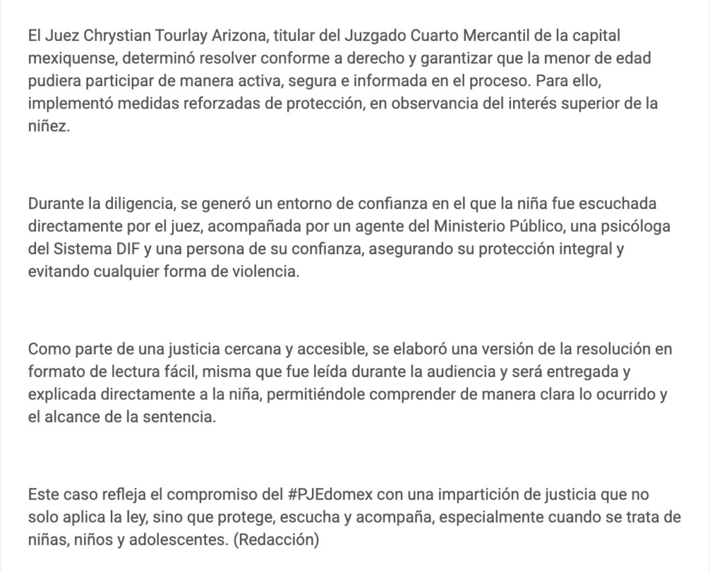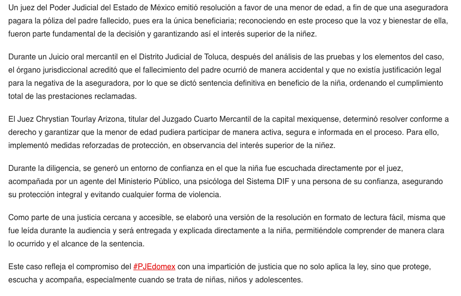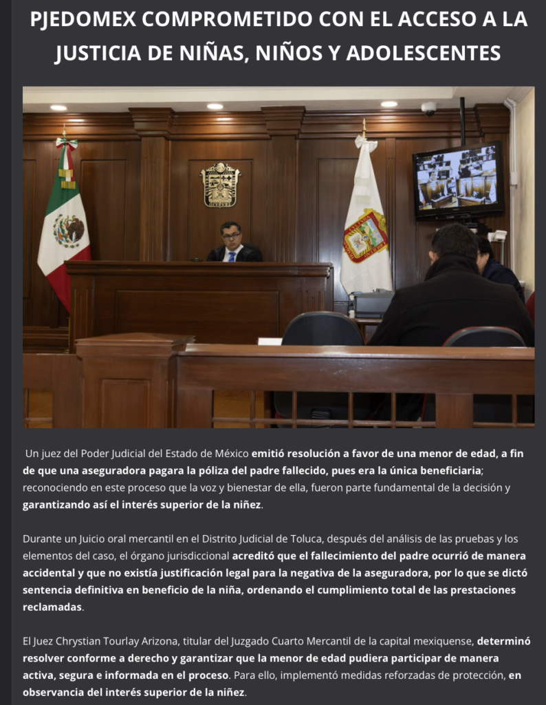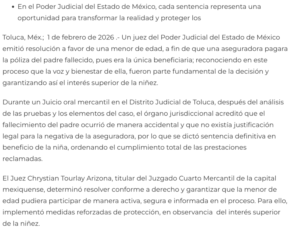Un juez del Poder Judicial del Estado de México emitió resolución a favor de una menor de edad, a fin de que una aseguradora pagara la póliza del padre fallecido, pues era la única beneficiaria; reconociendo en este proceso que la voz y bienestar de ella, fueron parte fundamental de la decisión y garantizando así el interés superior de la niñez.