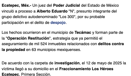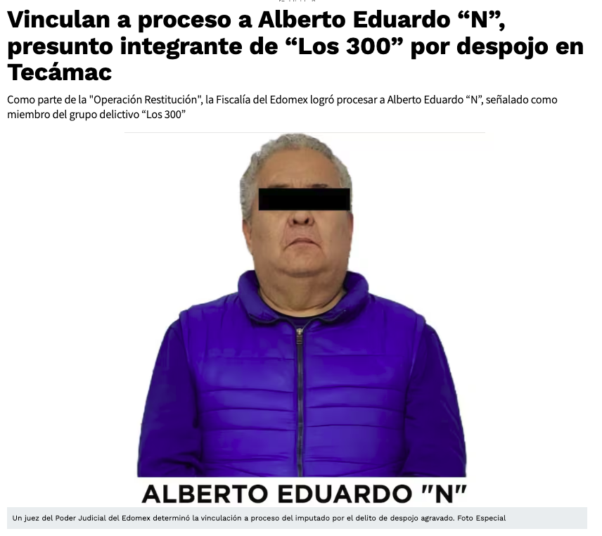 - https://www.eluniversaledomex.com.mx/seguridad/vinculan-a-proceso-a-alberto-eduardo-n-presunto-integrante-de-los-300-por-despojo-en-tecamac/